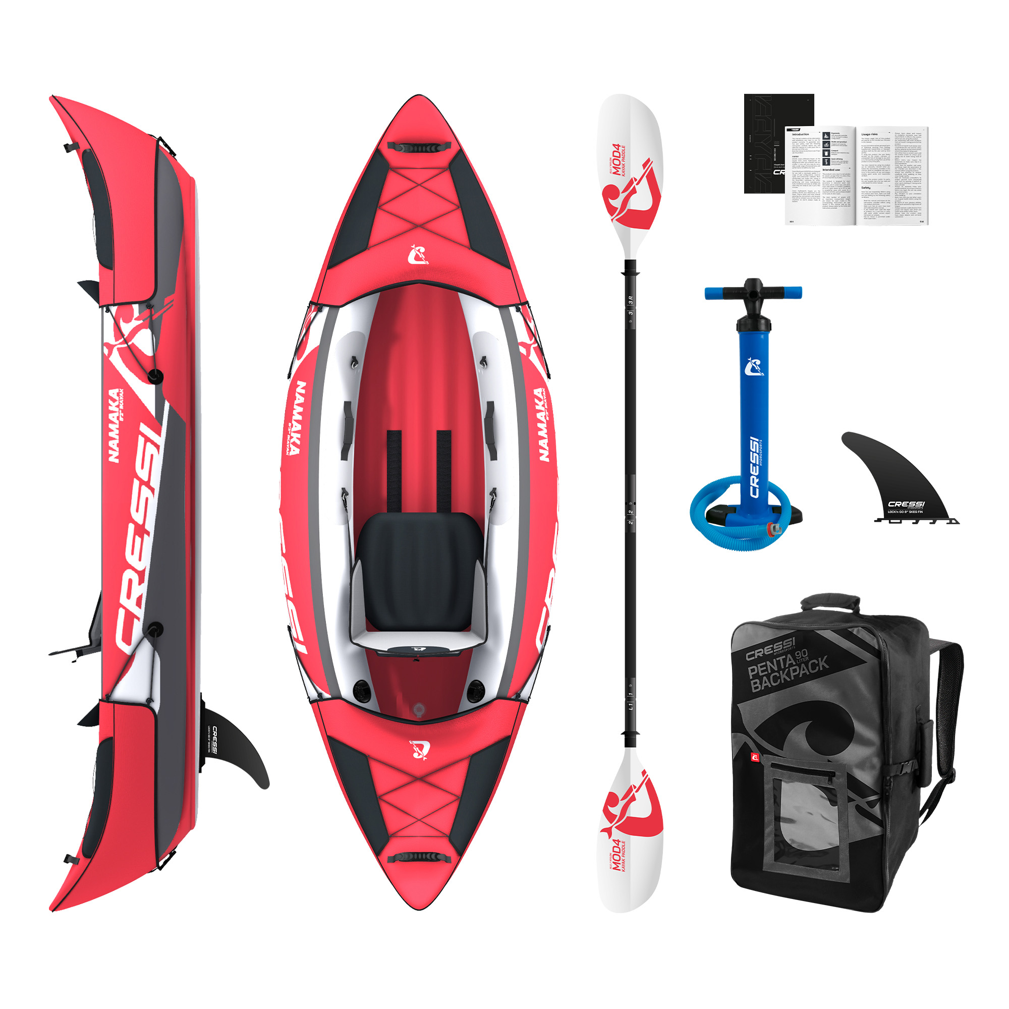 Namaka is the cressi kayak created to explore the coasts and nature, to move silently and reach places inaccessible by sailing or swimming, with zero emissions and the utmost respect for the marine environment. Available in two versions, single or double seat, namaka is an inflatable kayak with excellent stability thanks to its air chambers with tubular sections, which are ideal for following the waves. Comfort is ensured by the inflatable seats that provide a raised paddling position, while the velcro strips and adjustable straps allow the lumbar support to be moved and adapted along the entire cockpit. Namaka is equipped with nylon linings at the bow and stern with splash guards, practical bungee cords, handles to help carry it out of the water, a velcro oar holder and reinforced bottom with anti-abrasion layer. Both models are ready-to-use sets, supplied with all the accessories needed for inflation and immediate use, from the pump to the paddles (two for the double and one for the single) up to the quick-hooking fins. Made of hermetic 1000-denier weft multilayer material to provide the best stiffness/weight ratio. Lateral tubular air chambers with dedicated valves and reinforced anti-abrasion 7-compartment base. Lightweight construction for maximum comfort and performance. Certified according to the international quality and safety standard iso 6185-1 iii b
