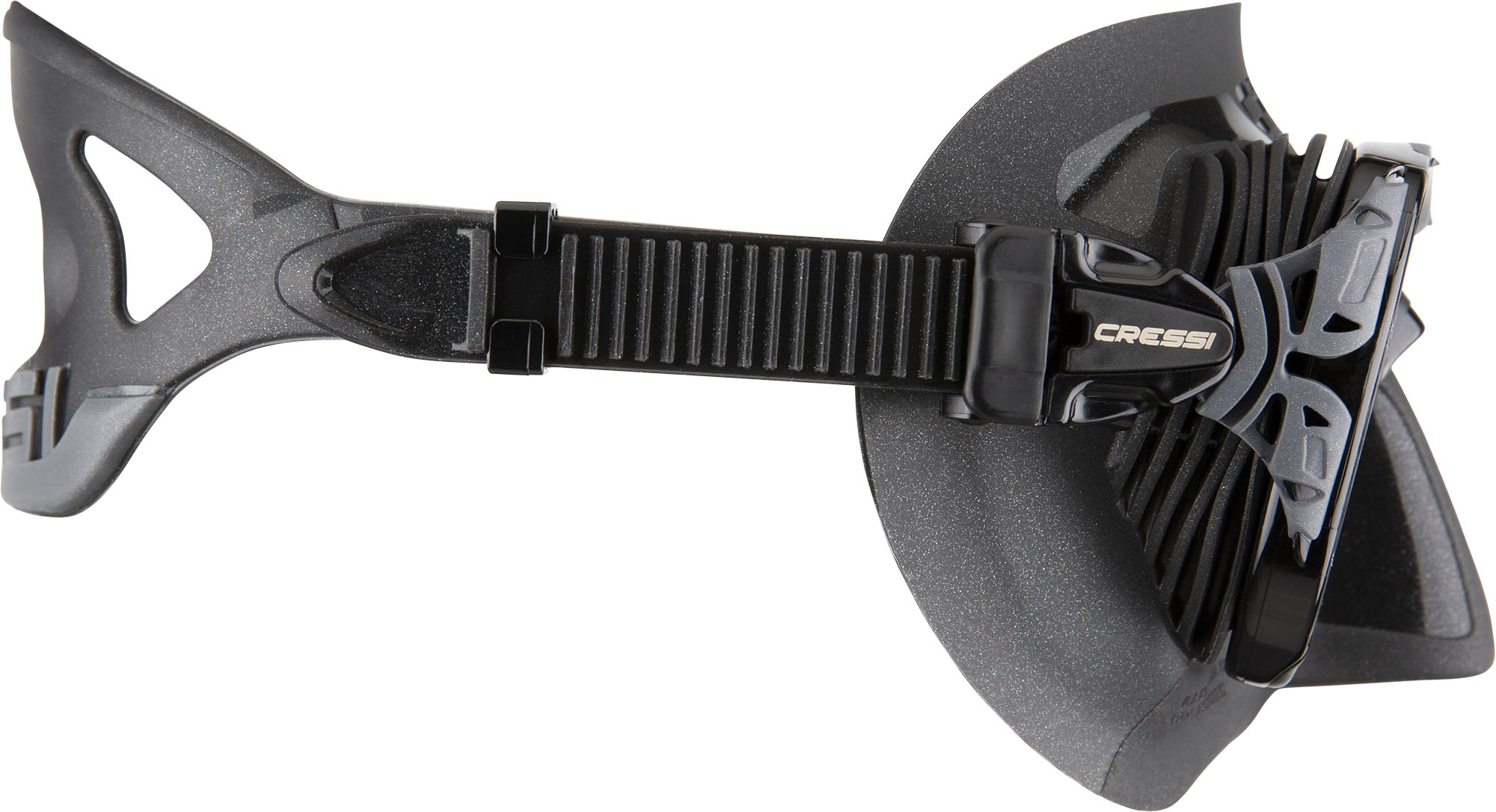 The Naxos mask is compact and smaller than a classic dive mask, but this unique feature does not reduce the field of vision, and thanks to new internal ribs, it adapts perfectly to any anatomy of the face. Naxos, like Quantum, not only offers increased downward vision but also avoids the phenomenon of fogging by thermoregulating the warm, moist air that escapes through the nose inside the mask. This is channelled by a system of membranes in the mould around the eyes and nose, which deflect the flow towards the rubber walls and not towards the glass. On the outside of the walls is a cooling system consisting of two small heat exchangers that function like radiators. The effect is that the temperature inside the mask is lowered, bringing it closer to the outside temperature, and that moisture droplets are trapped before the air reaches the glasses, thus preventing them from fogging up.