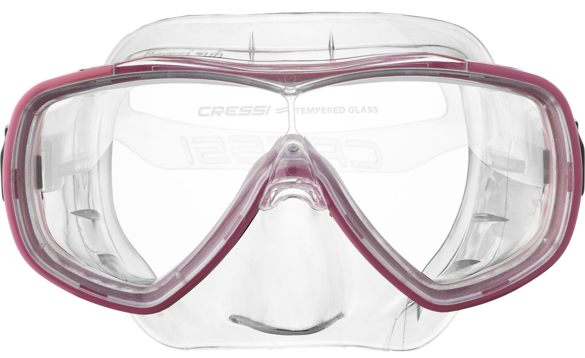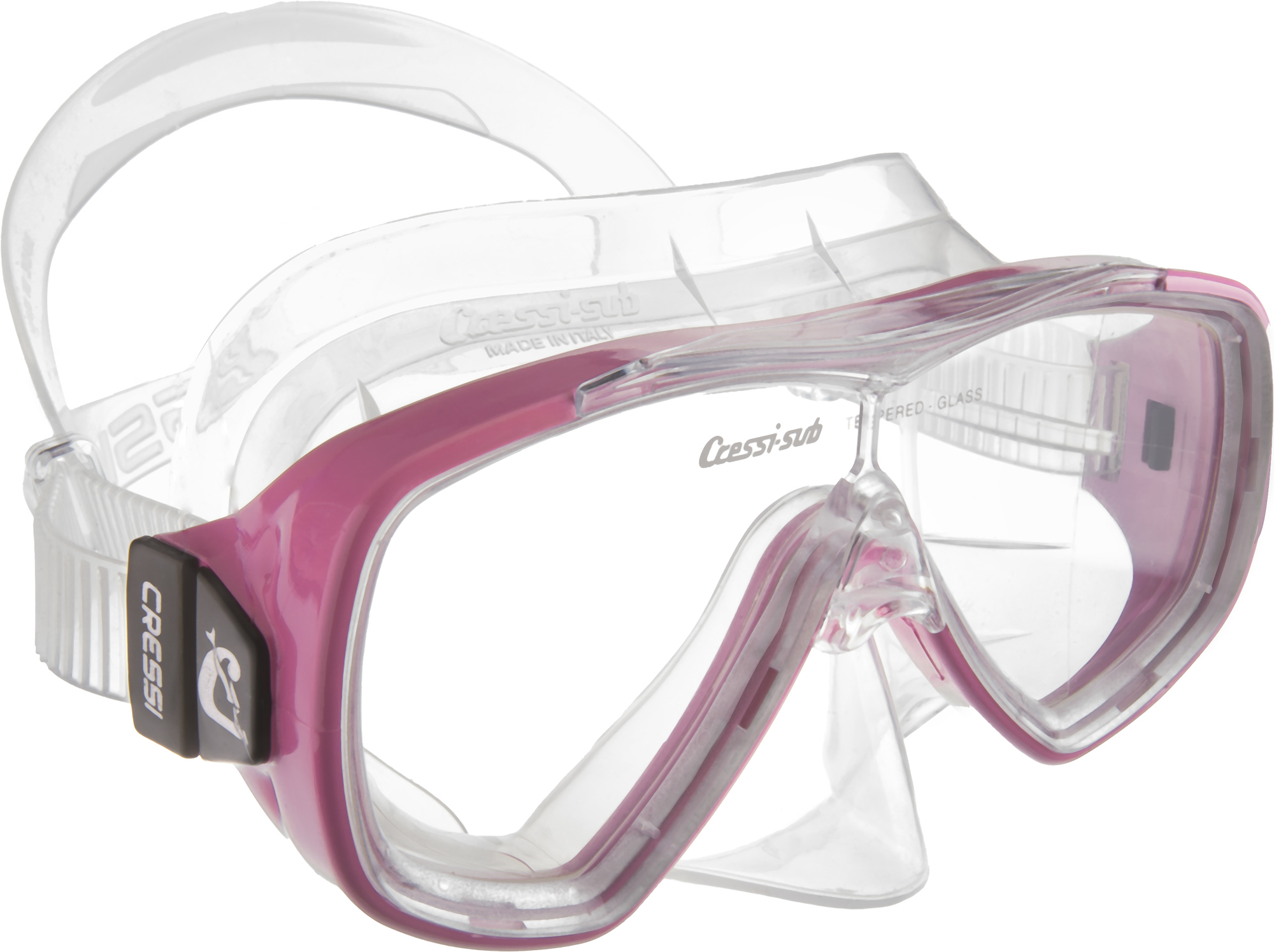 This mask has a single tempered glass lens, and is designed for snorkeling, swimming and scuba diving.The skirt is made from soft hypoallergenic transparent silicone. The visibility provided by the single lens and the unusual shape of the frame extends in all directions. Excellent seal on many face types, average internal volume.