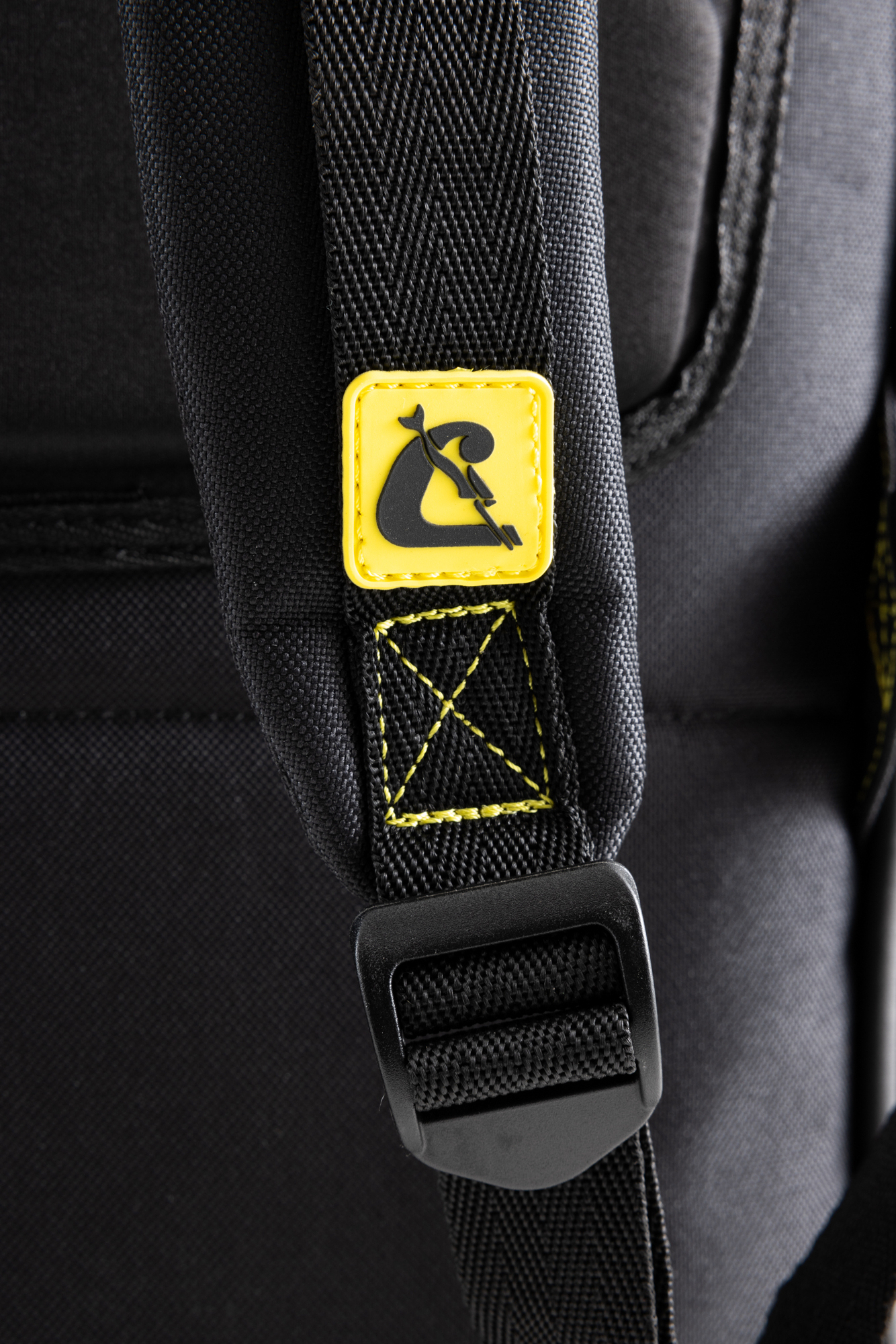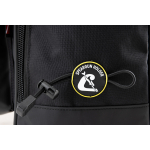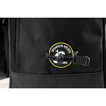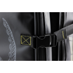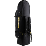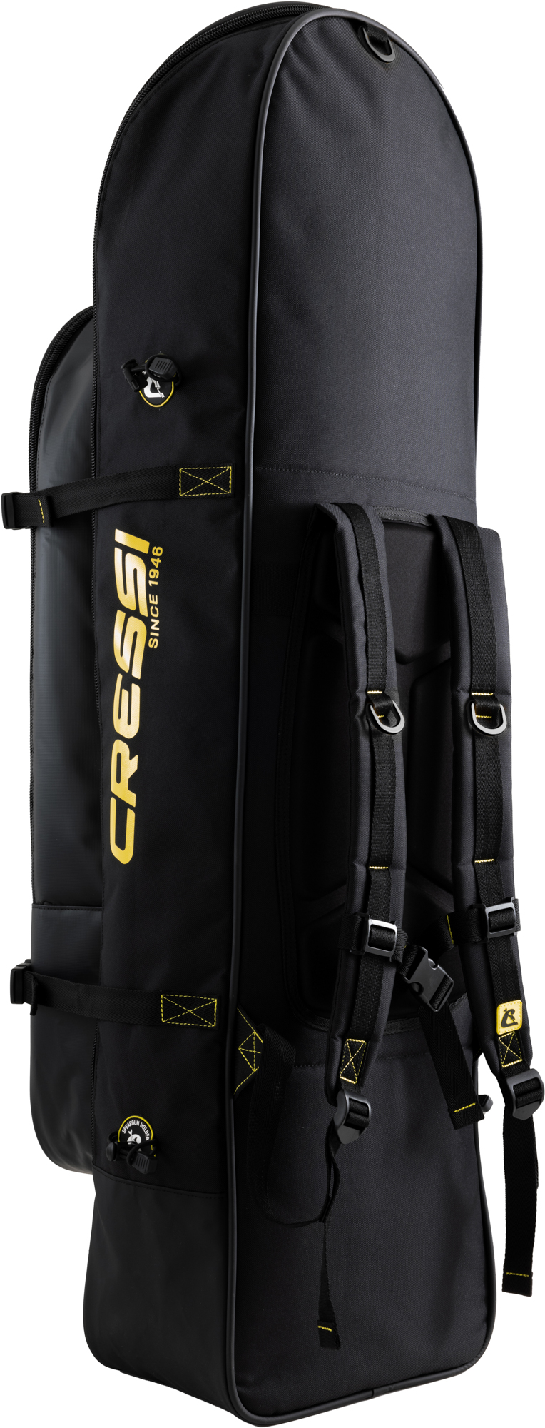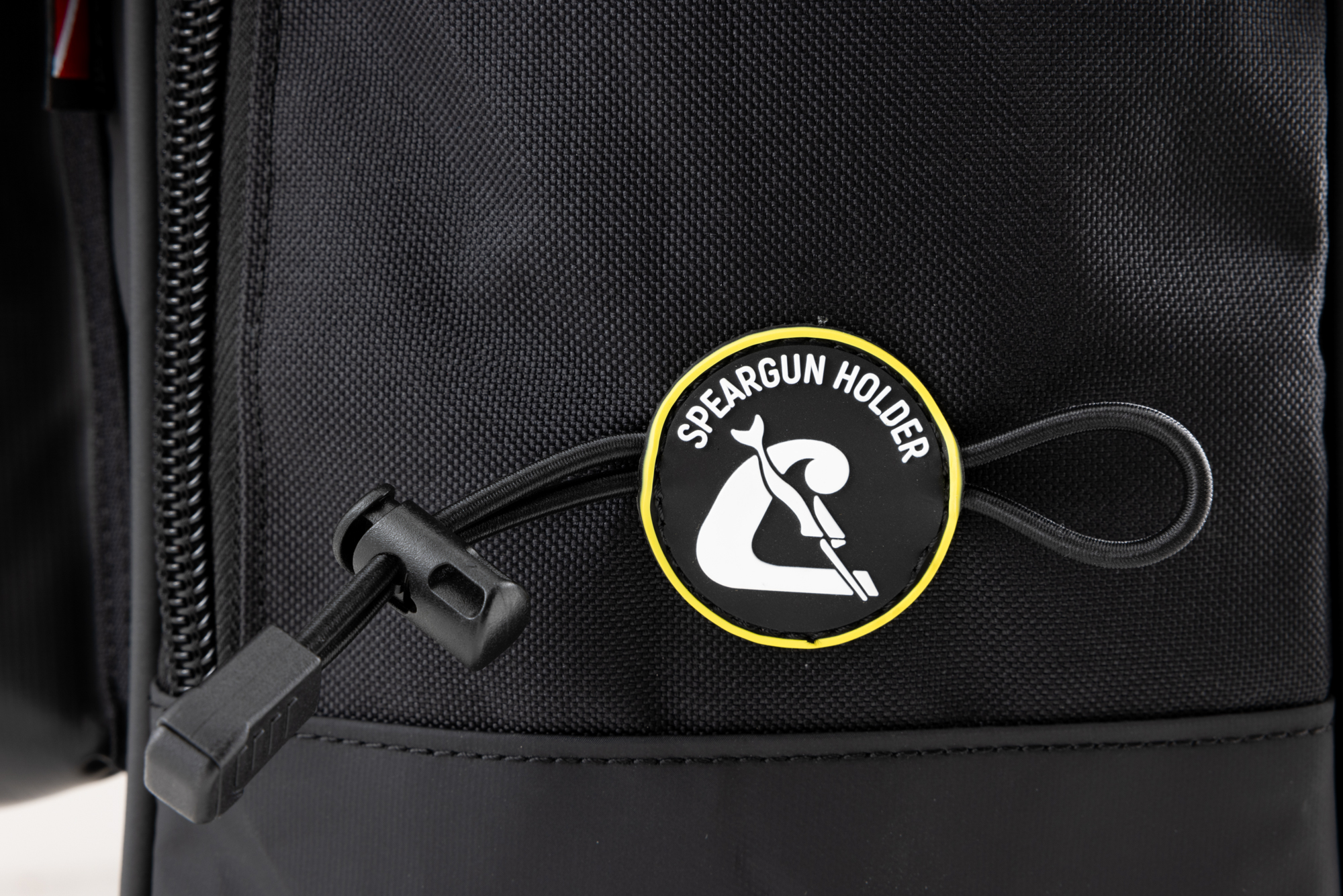 The Piovra backpack bag is perfect for sports fishing and freediving equipment. It is made of DRY, water-repellent material, although not watertight. The main compartment, with breathable, moisture-repellent mesh at the lower end, can hold freediving fishing gear, such as a wetsuit, long fins (up to 100 cm), mask, snorkel, belt, knife, and various accessories. The secondary compartment, i.e. the outer pocket, is like a cooler bag for carrying cold drinks or fish. The outer elastic braided lace allows other items, such as a towel, to be placed in it. The two sides are equipped with fastening systems for two fishing rifles. At the top end of the bag there is a D-ring. The two shoulder straps for carrying are adjustable and a side handle makes it easier to grip. The reflective print on the front ensures greater visibility. The main compartment is equipped with eyelets for a padlock.