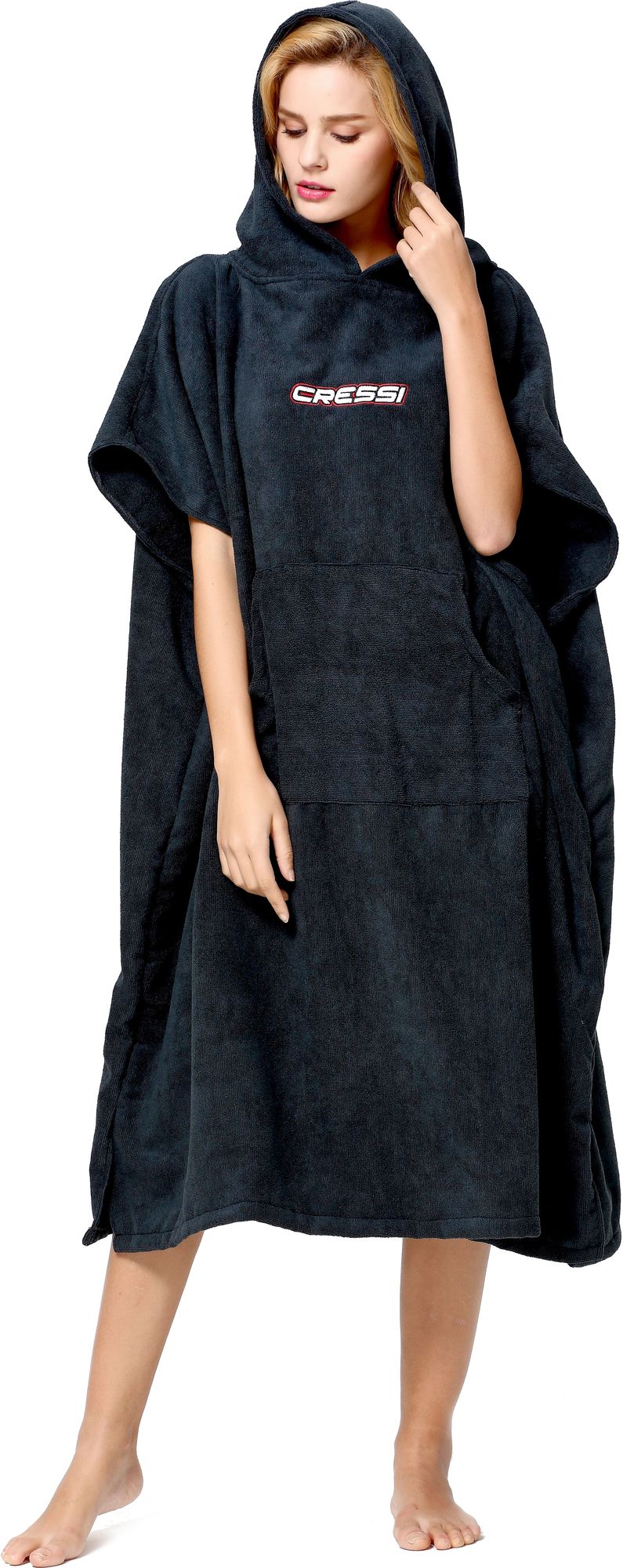 Cressi poncho is a quick dry microfiber changing towel for swim outdoor sports. Big enough to help change out of wetsuit or swimsuit after activities. Big hoodie, wide sleeves and knee length design keep you warm and easy to move inside of it. Provided by a comfortable large pocket on the front. Unisex design – fits womens and mens. Two colors available