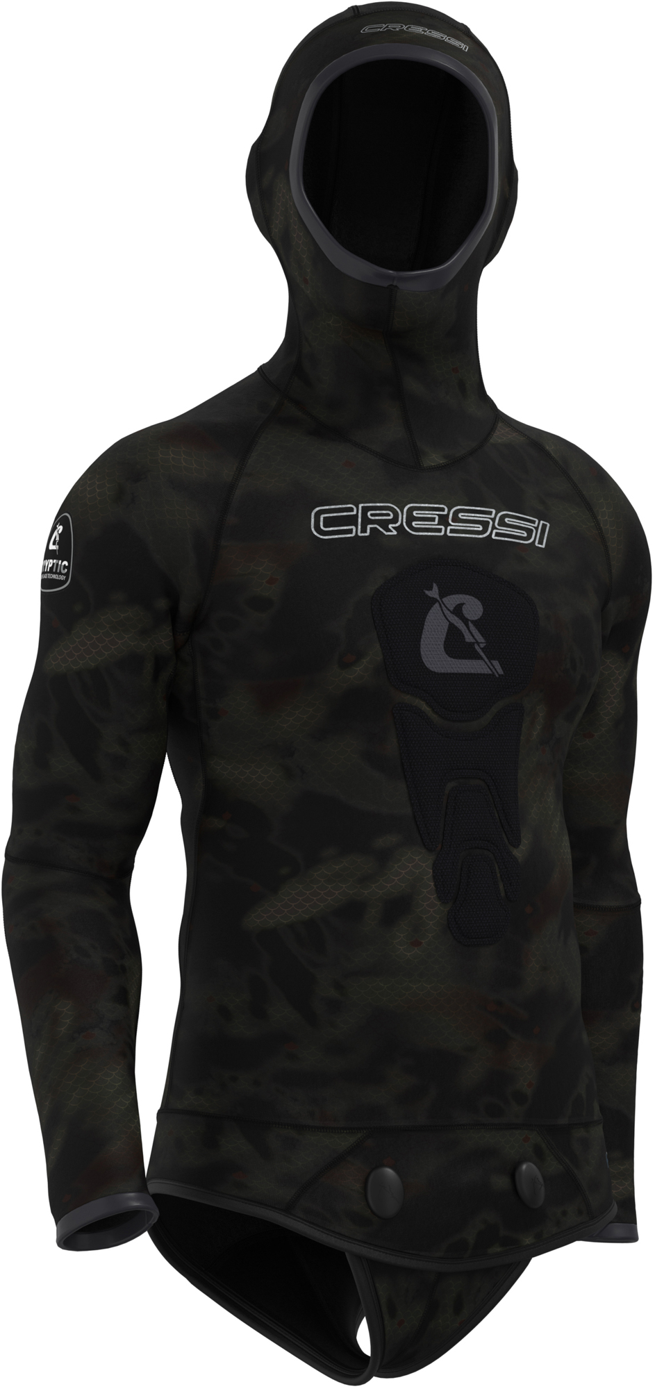 This new camouflage suit uses a special digital printing system that allows for very high resolution images to create an exclusive camouflage. Cressi’s new ‘Cryptic Camouflage Technology’ is based on a real image of the fish (in this case the anglerfish with its dominant colours) to create a camouflage that is very similar to the original and then modified to create a unique and repetitive effect. The wetsuit consists of two parts (jacket and trousers) of 5, 7 mm. The materials used are: highly elasticised camouflage on the outside, split neoprene on the inside. The cut is derived from the Tracina model, now recognised as a very wearable model. The new chest reinforcement is designed to ensure a strong grip when loading rifles. The new reinforcement on the knees offers additional protection against chafing without compromising the elasticity of the materials.