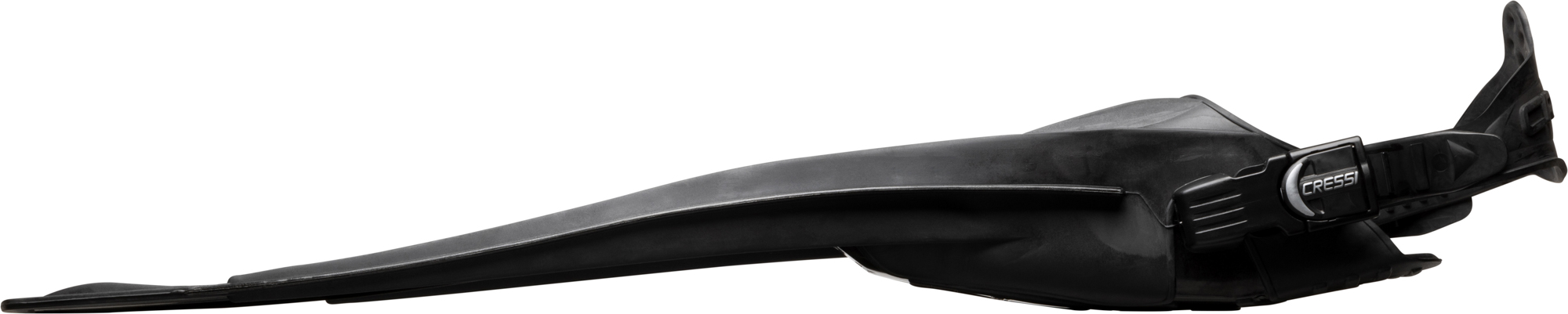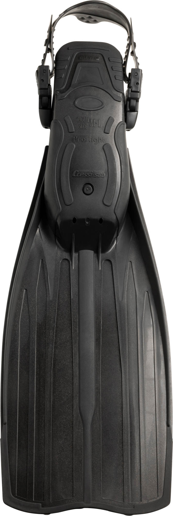 A highly advanced design for this fin that is moulded from two materials with very different characteristics: a strong polypropylene for the blade and soft elastomers (thermo rubber) for the foot and protective inserts. The result is an extremely light and well-balanced fin, of average size, with surprising reaction time and a formidable thrust. The side stringers that extend all along the blade and two flaps situated along the end of the blade itself make the fin very directional. The blade originates from the upper part of the foot pocket, with a 20% increase in useful surface area compared to a traditional fin of the same length. The foot pocket is computer designed and guarantees ideal transmission of the leg-fin thrust. The lightness and perfect balance of the materials, together with the extremely modern design, make rondine pro light a generous fin that provides exuberant performance without too much physical effort. These fins are perfect both for beginners and for professionals and are very common amongst instructors and technical divers