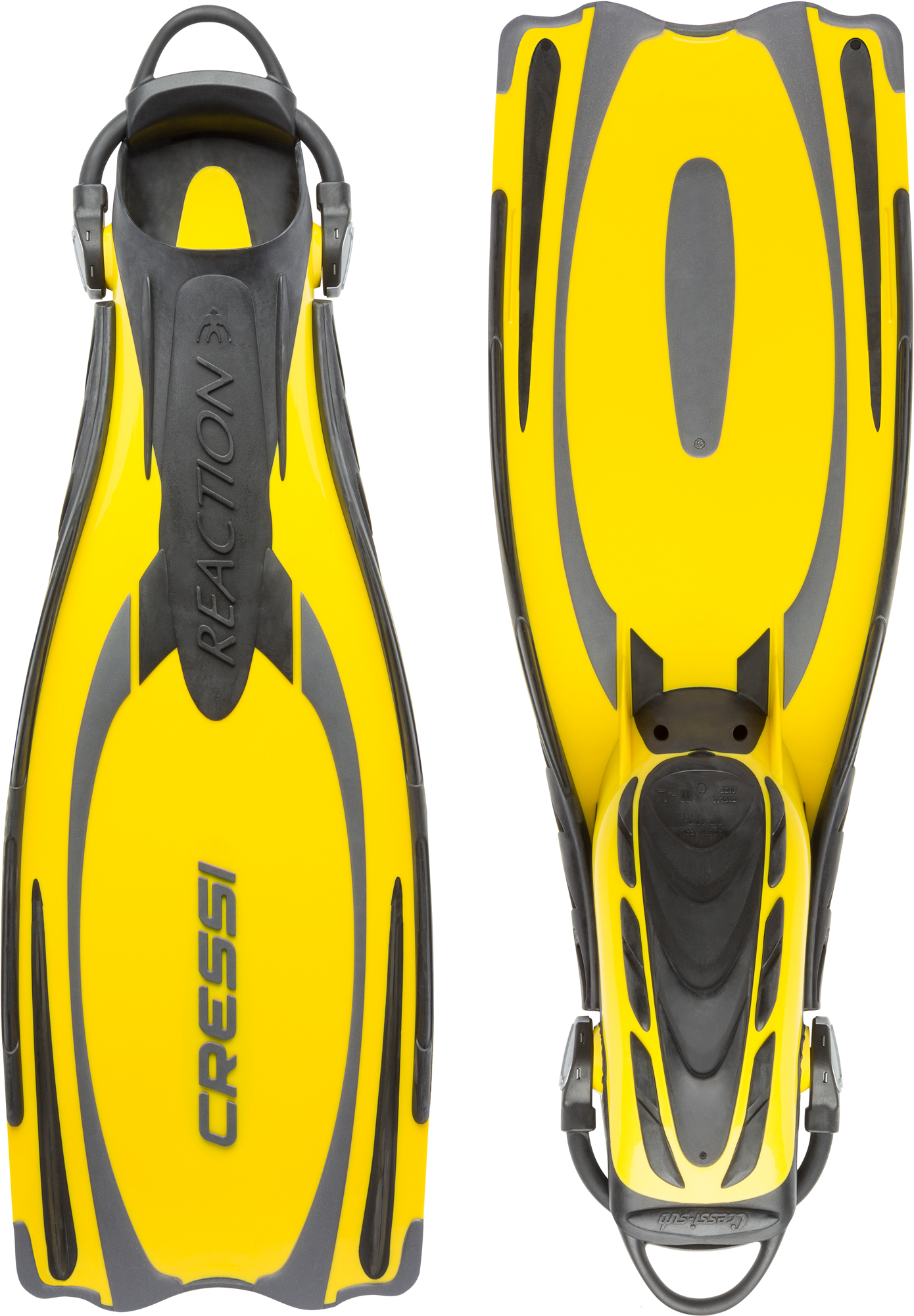Reaction capitalizes on exclusive patented cressi moulding technology that uses three materials and guarantees unparalleled performance. Reaction picks up on many of the innovative characteristics introduced by the rondine a, such as how the blade originates directly from the back of the footpocket, the blade with differential thickness, the dual-material stringers, the sole molded entirely in non-slip material, the extremely comfortable foot compartment designed by computer, and the innovative secure buckles. Along with these excellent features, reaction adds a new longer, more flexible, and lighter blade that can produce excellent propulsive thrust with minimal muscle fatigue and wasted energy. The perfect fin for the modern diver, beginners and professionals alike, it’s lightweight, easy to use, and non-fatiguing, but still capable of producing impressive propulsive output, sufficient to safely tackle even the most critical diving situations