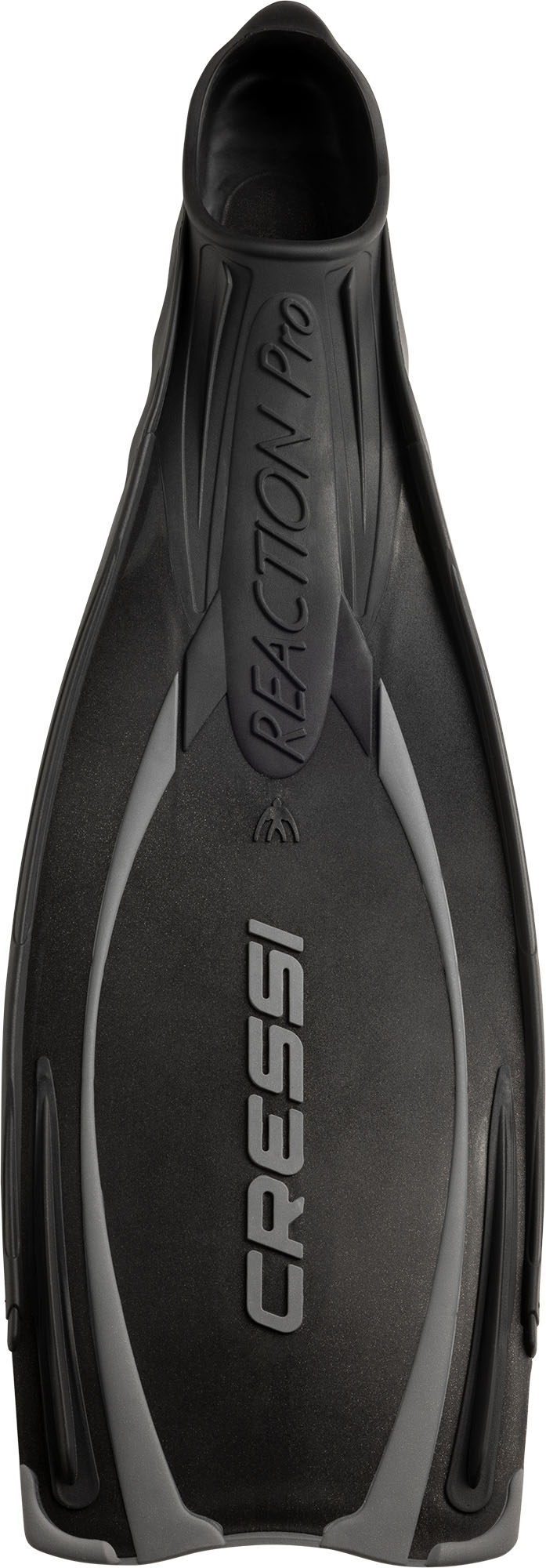Reaction pro is an adventuresome fin derived from cressi deep freediving models, which also introduces the use of more responsive materials to the sector of normal-length full-foot fins. The blade is not in fact made using a copolymer, but instead it is polypropylene, which is exceptionally lightweight and responsive. This material is paired with a comfortable thermo-rubber that is used in the footpocket, the side stringers, and the various inserts. The blade starts from the upper side of the footpocket, increasing the useable surface by 20% over traditional fins of similar length. The optimized, highly anatomical footpocket is designed by computer, ensuring that leg-to-fin power is conveyed perfectly