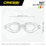 The Right Goggles feature a classic round lens shape. The lenses are also slightly curved which provides excellent peripheral vision. The TPR gaskets around the lenses form a comfortable, watertight seal around the eye socket. The lenses feature external anti-scratch treatment, UV protection and internal anti-fog treatment. The headband is made of 100% hypoallergenic silicone for maximum comfort and fit. The strap and buckle is also interchangeable with all other goggles and masks in the Cressi Swim Line.