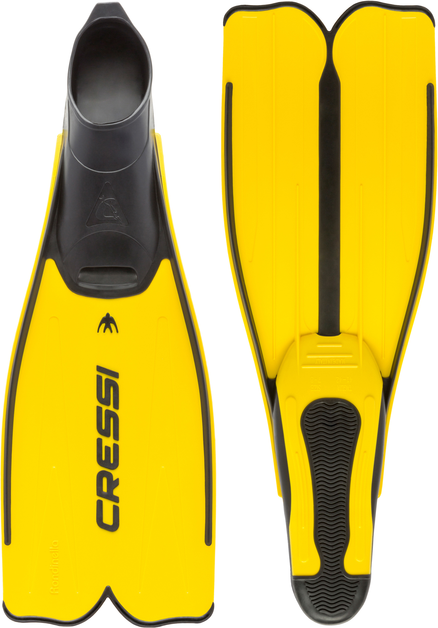 All of cressi’s fifty-year experience has gone into these fins, which are a modern revival of the successful principles of the glorious light blue rubber rondine fins. The blade is made from light and at the same time reactive polypropylene and during moulding is coalesced with a soft, flexible thermo-rubber (elastomer), used for the foot pocket, for the frames and for some inserts. This mix makes the rondinella fins light and powerful: they are easy to use, not too demanding, and perform generously at the same time. The computer-designed foot is enveloping and anatomical, making it easy to put them on and perfect for extended use. Rondinella fins are perfect for snorkelling, free diving, and long swims