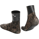 These socks for fins with strap or foot pocket are made of soft highly elastic nylonlined new camouflage neoprene 3 mm. They prevents heat loss and keep feet warm. The smooth skin neoprene on the ankle allows maximum adherence between the sock and the leg of the wetsuit, reducing the passage of water. The sole is entirely non-slip. The construction of the blind stitch seam further improves comfort and aesthetics