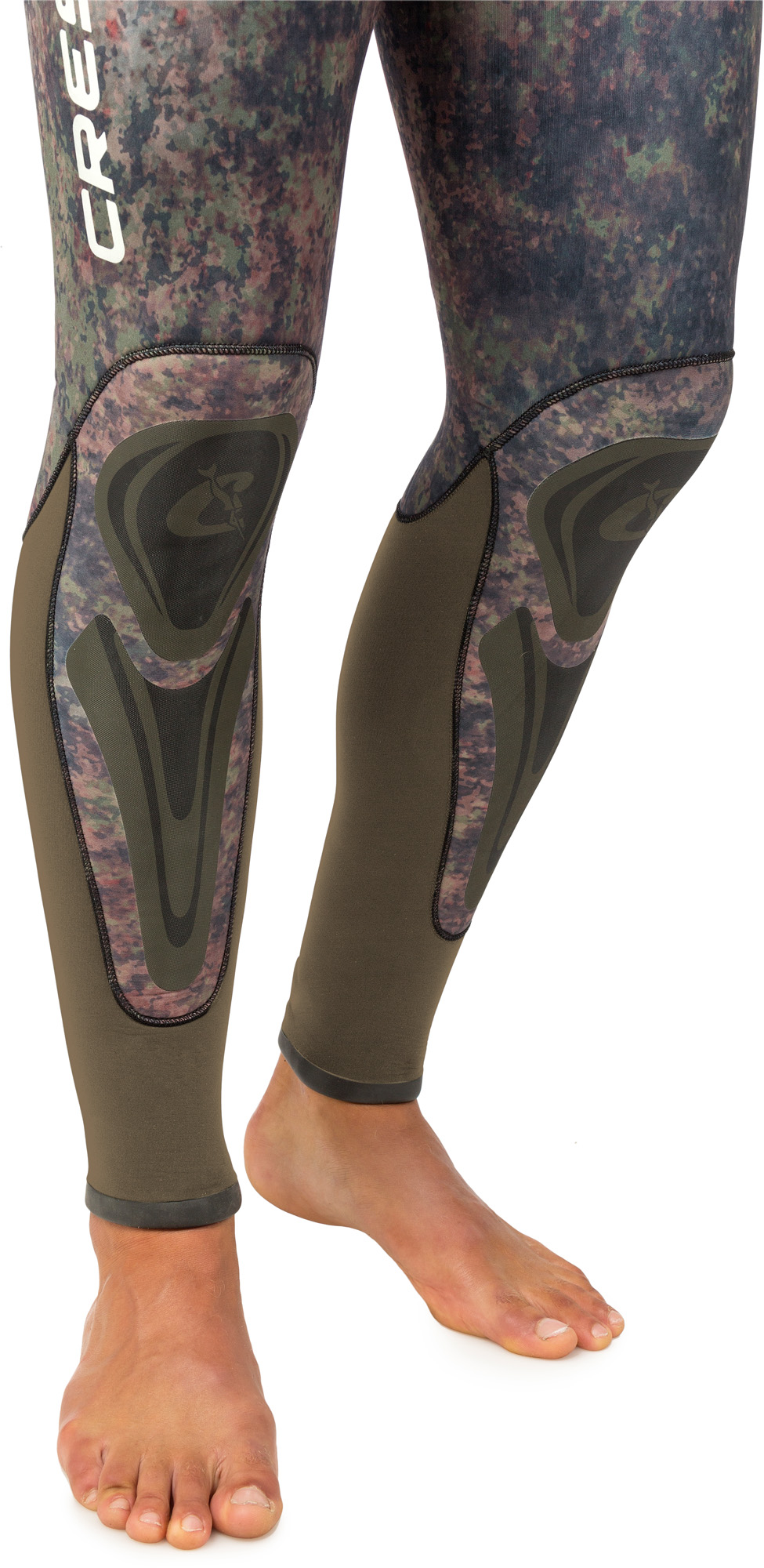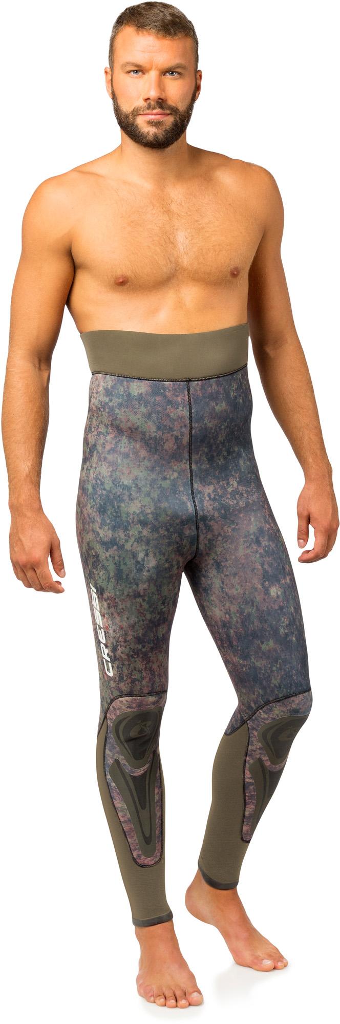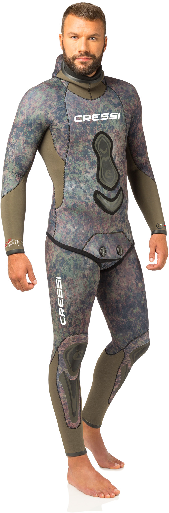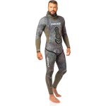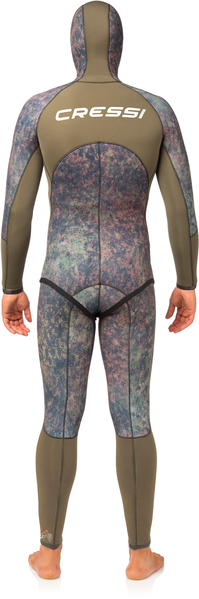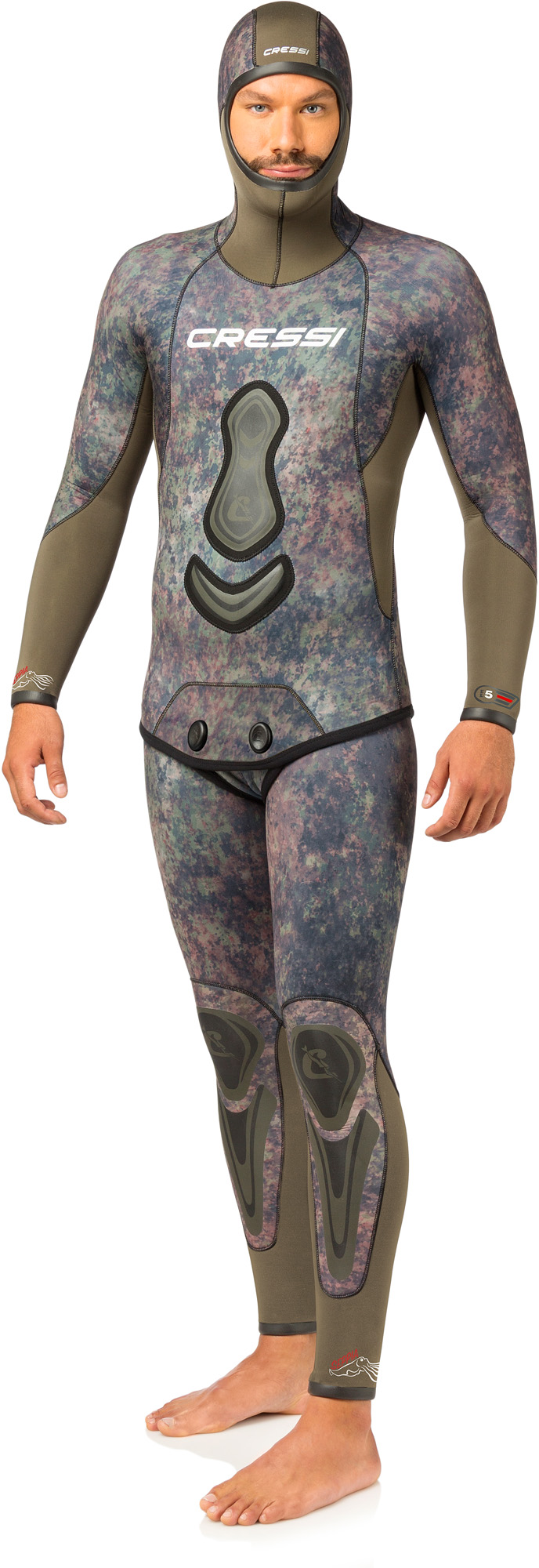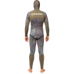 When wet changes colour accentuating mimetism. Wetsuit created with the exclusive new cressi green / brown camouflage, computer-designed to make it more difficult for prey to create solid images, thereby confusing the wearer with the background. Preformed anatomical cut. Jacket with padded reinforcement on the chest. Smooth skin with watertight seals on hood, wrists and ankles. Reinforced anti-abrasion lining on the chest and knees. High-waisted trousers with watertight seals on the ankles and waist