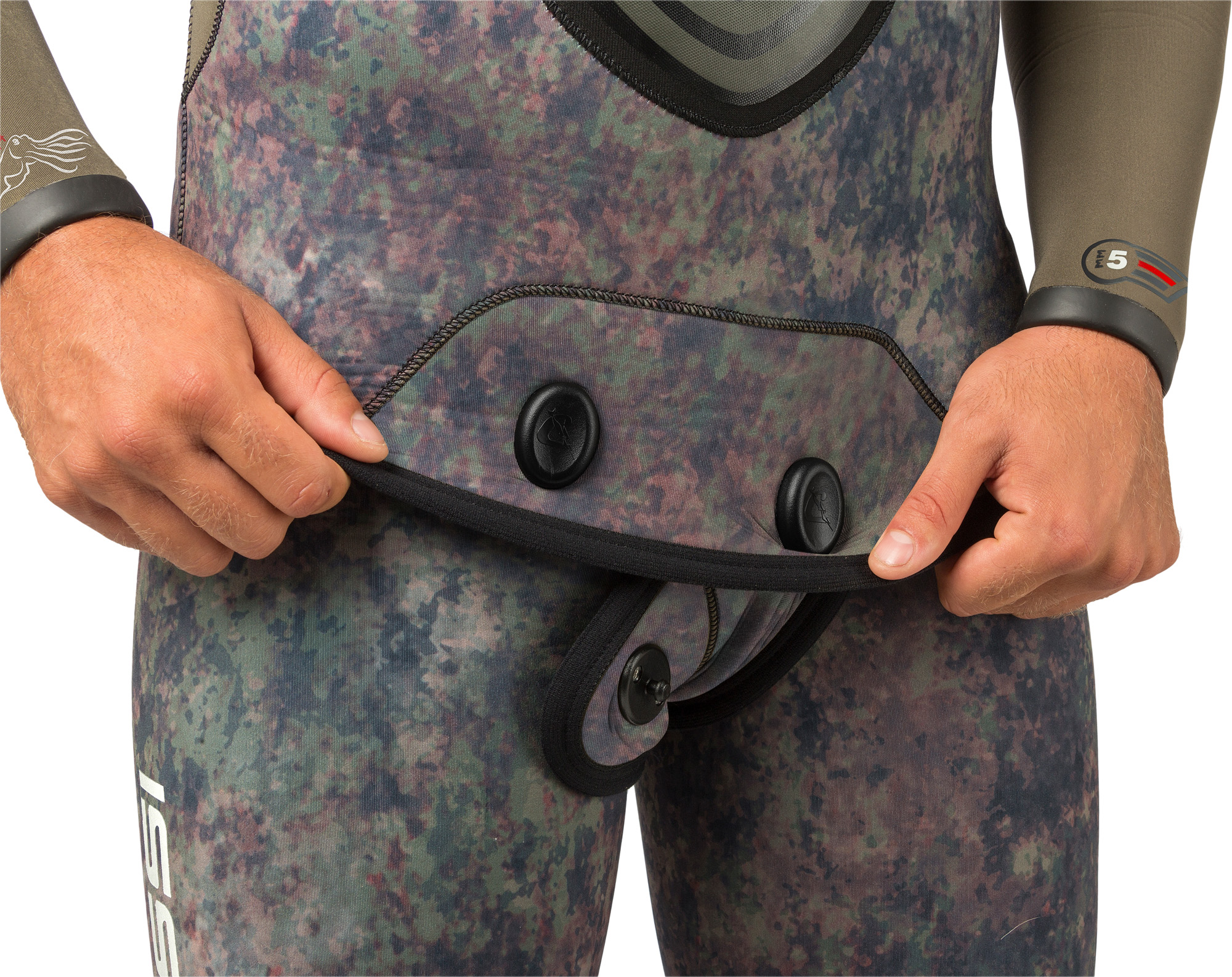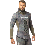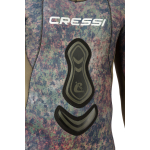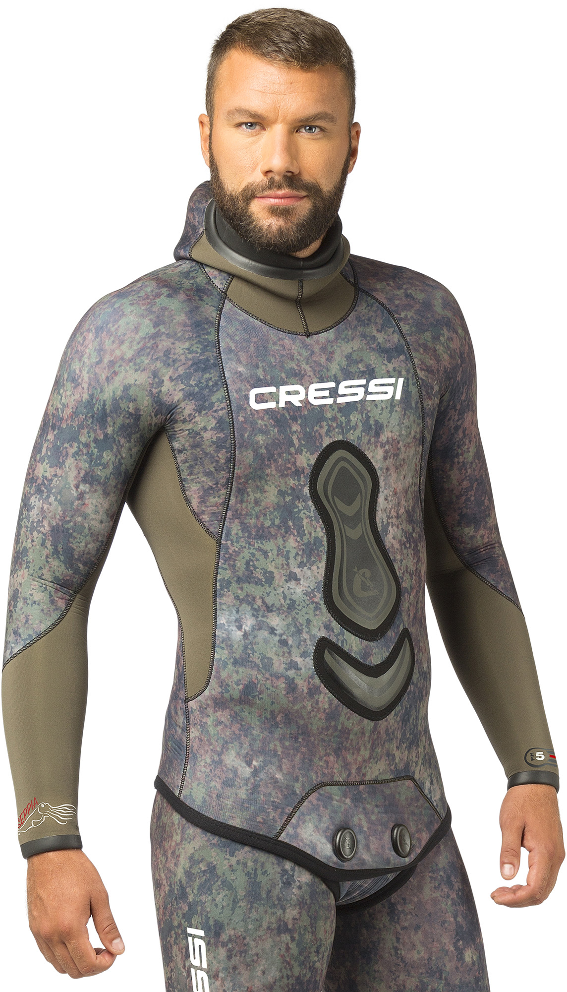 When wet changes colour accentuating mimetism. Wetsuit created with the exclusive new cressi green / brown camouflage, computer-designed to make it more difficult for prey to create solid images, thereby confusing the wearer with the background. Preformed anatomical cut. Jacket with padded reinforcement on the chest. Smooth skin with watertight seals on hood, wrists and ankles. Reinforced anti-abrasion lining on the chest and knees. High-waisted trousers with watertight seals on the ankles and waist