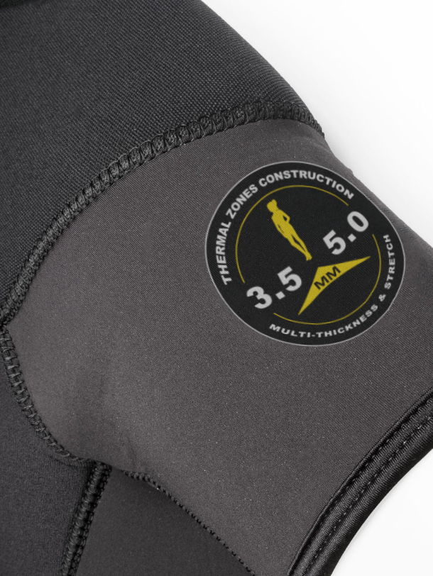 • A multi-thickness design (5 mm on the back and chest; 3.5 mm on the underarms and inseam) adds warmth while maintaining flexibility.
