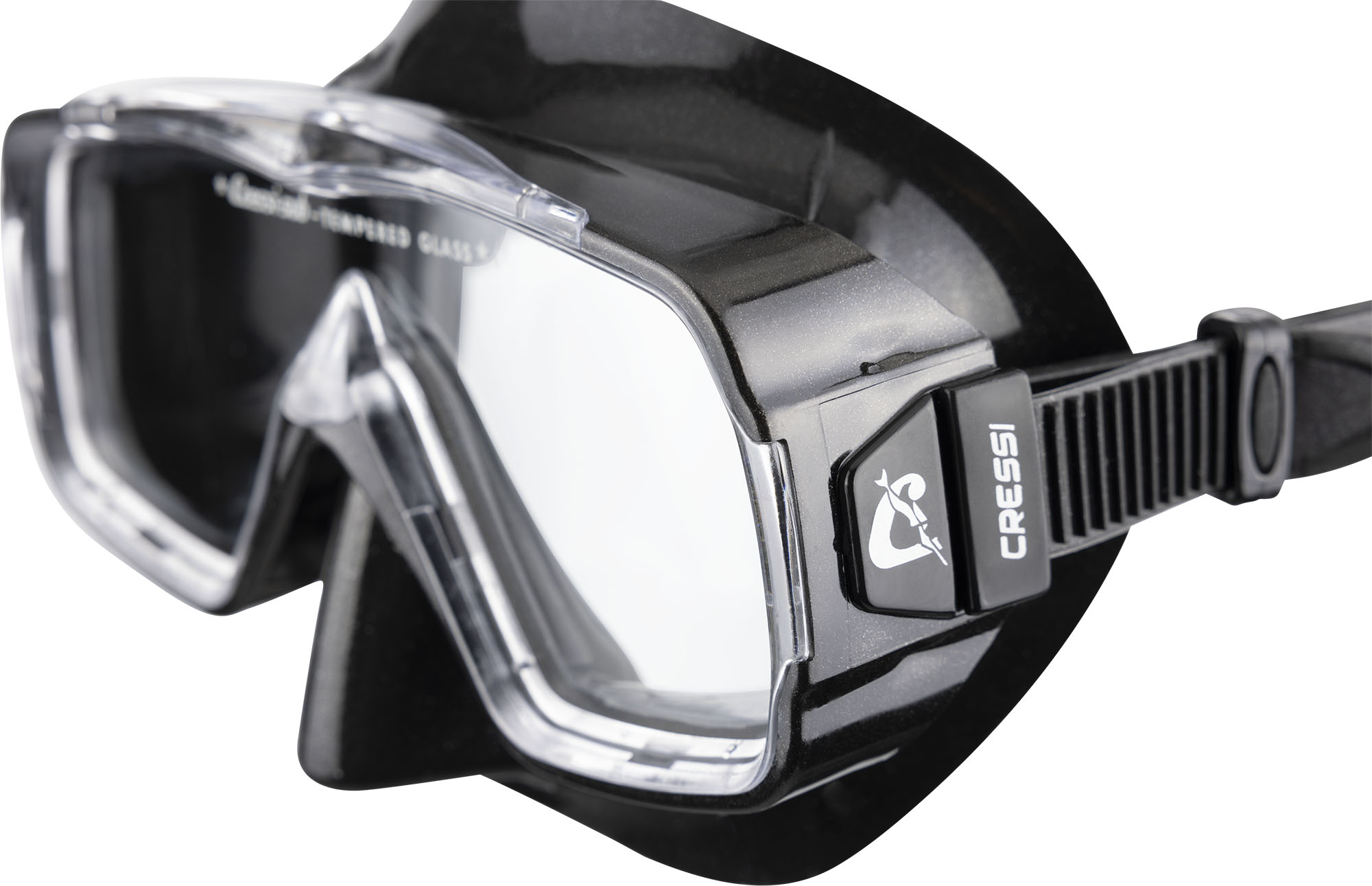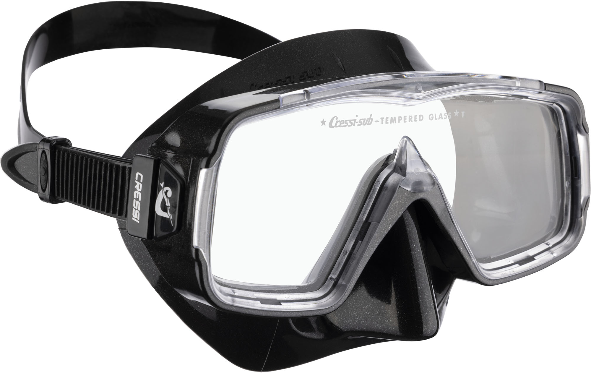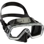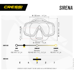 This Sirena has a single tempered glass lens and is designed for snorkeling, swimming and scuba diving. The skirt is made from soft hypoallergenic transparent or black silicone. The visibility provided by the single lens and the unusual shape of the frame extends in all directions. Excellent seal on most face types, thanks to the internal seal ring housing average internal volume. It has quickrelease strap buckles.