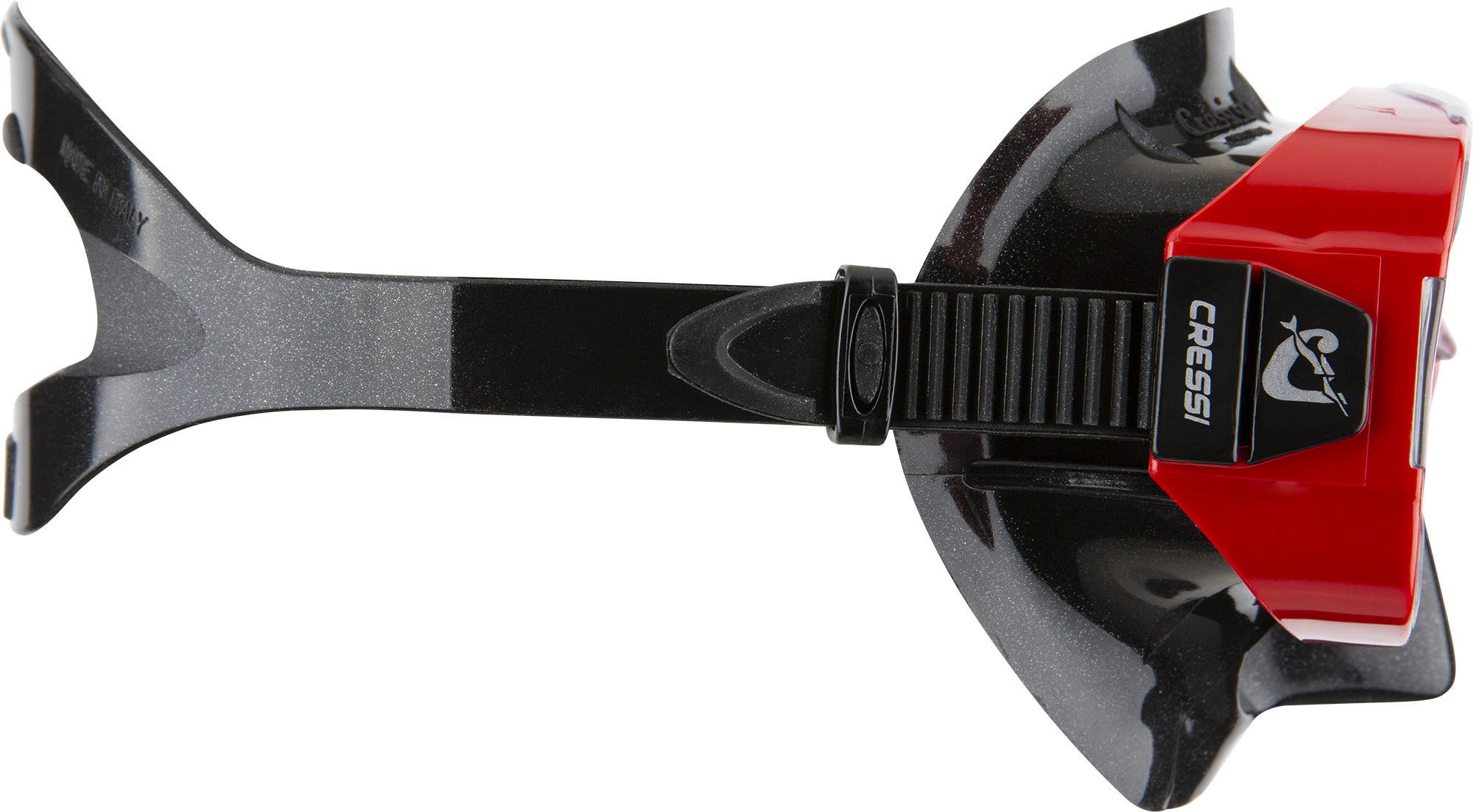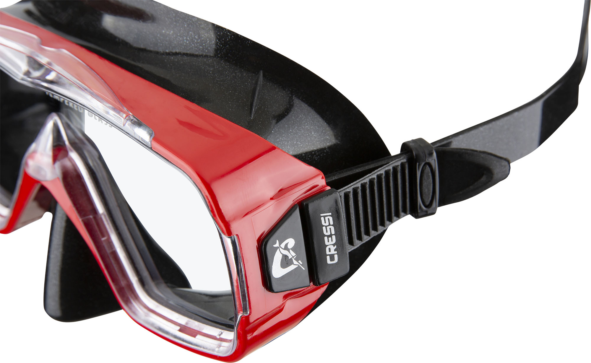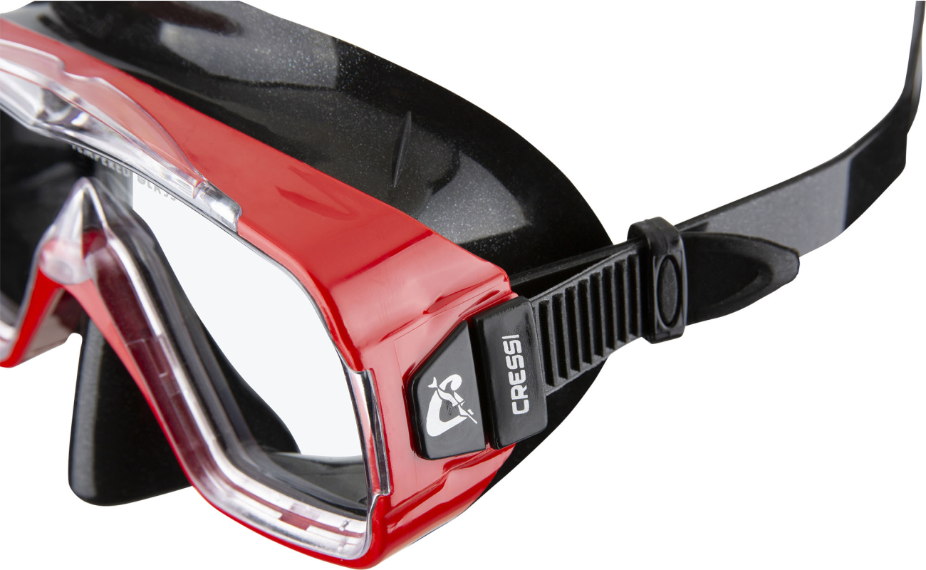 This Sirena has a single tempered glass lens and is designed for snorkeling, swimming and scuba diving. The skirt is made from soft hypoallergenic transparent or black silicone. The visibility provided by the single lens and the unusual shape of the frame extends in all directions. Excellent seal on most face types, thanks to the internal seal ring housing average internal volume. It has quickrelease strap buckles.