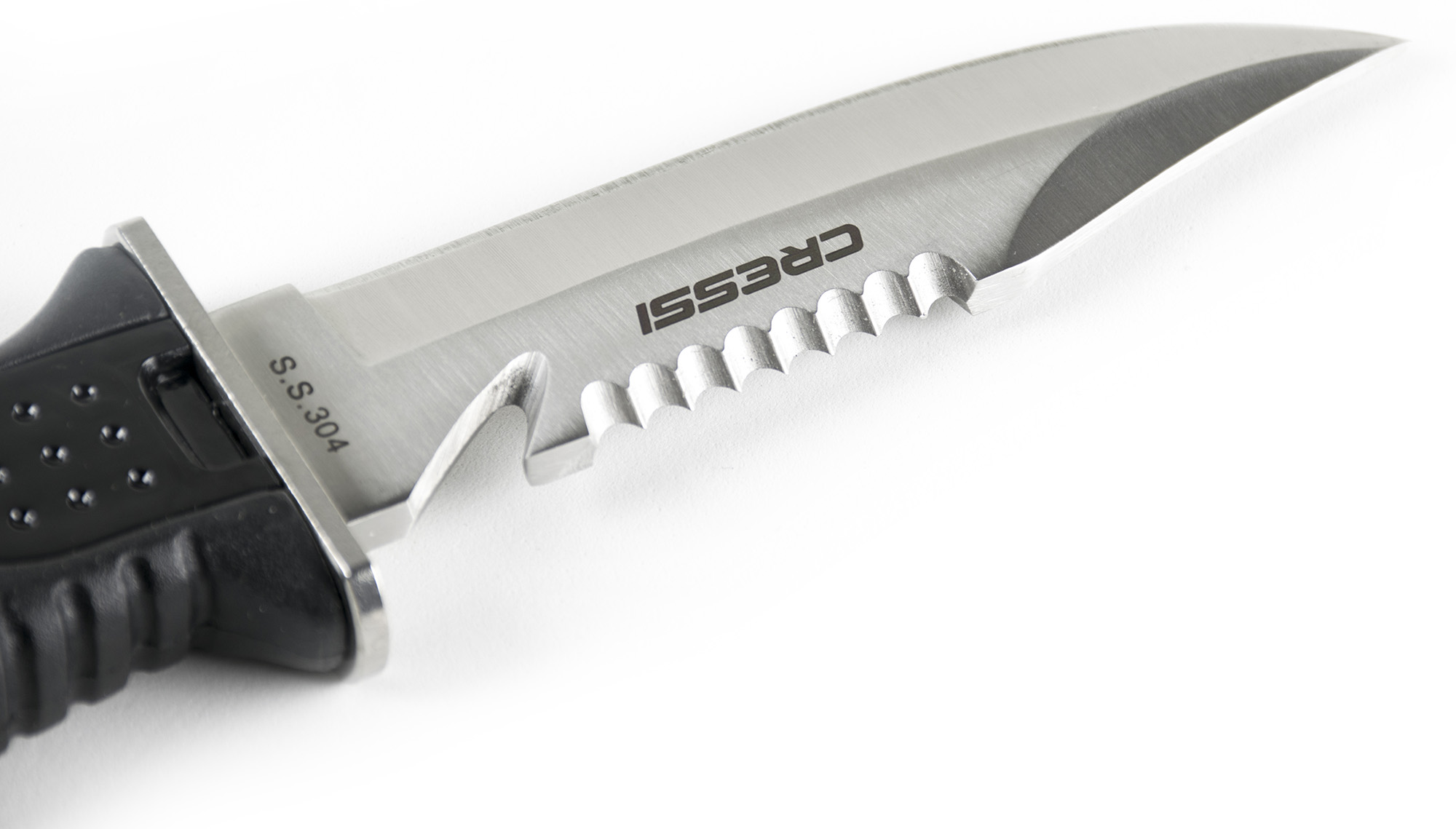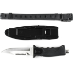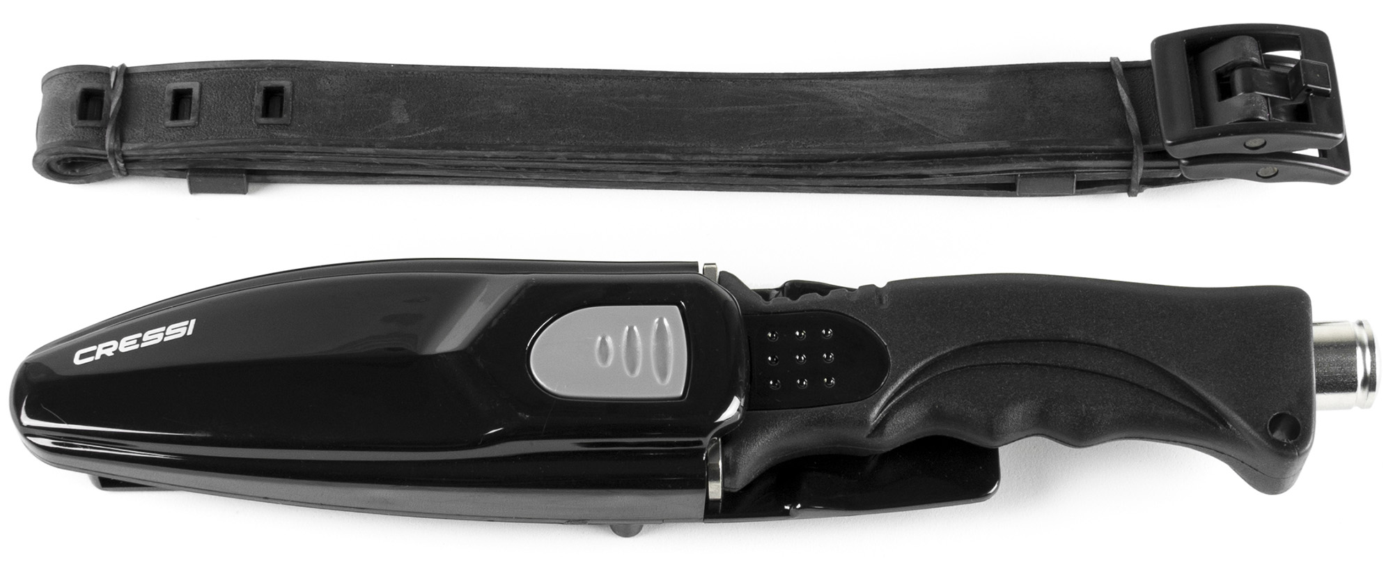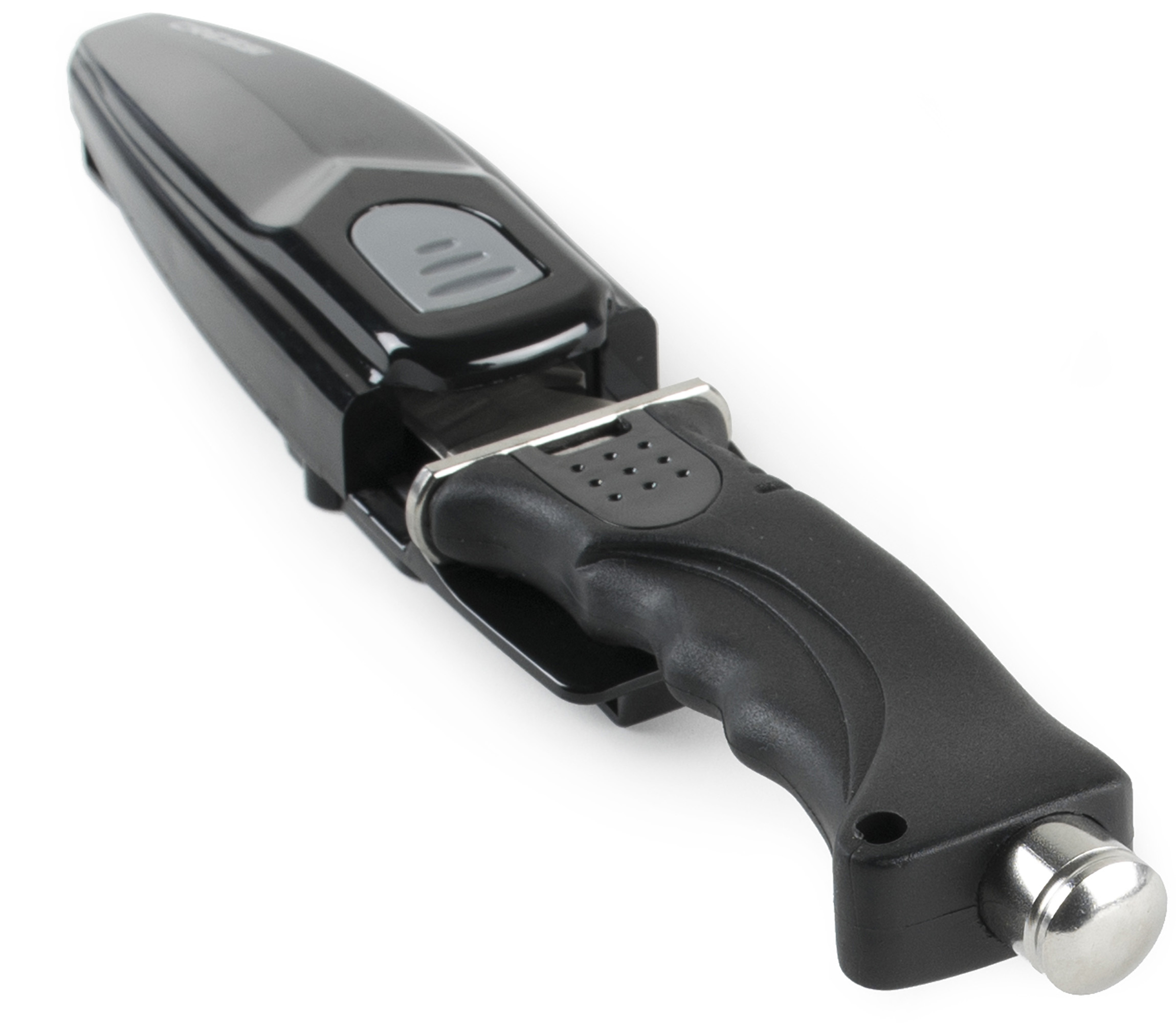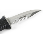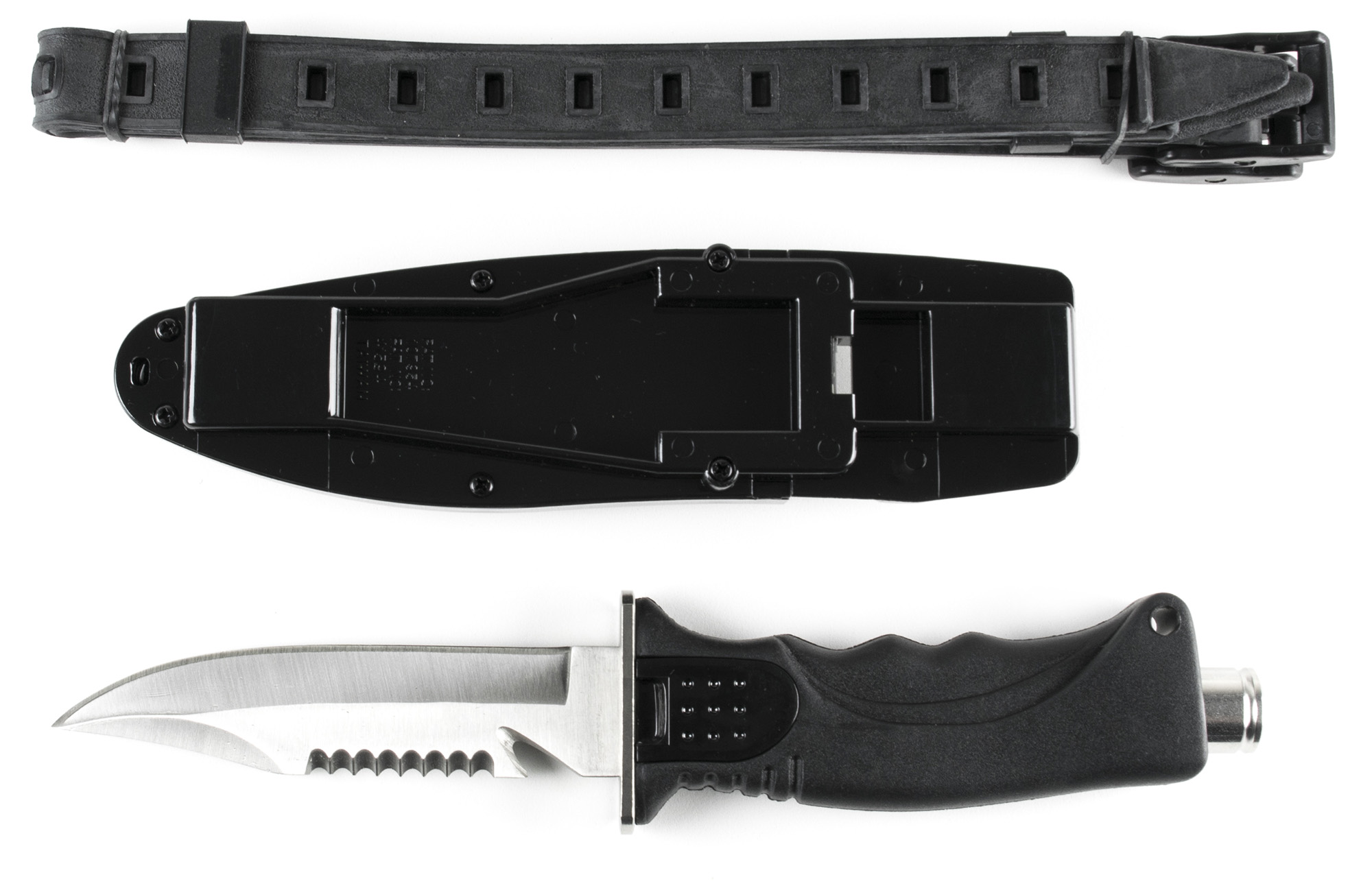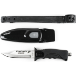 Skorpion is a modern, medium-sized knife with a futuristic design and a strong, tempered blade. One side of the stainless steel blade is straight-edged, the other one is serrated right along the blade; they are both very sharp and effective for line cutting. It is separated from the blade by a small technopolymer thumb tab. Sheath with locking mechanism to allow one-hand release. The knife comes with two, standard issue straps to attach it to your leg