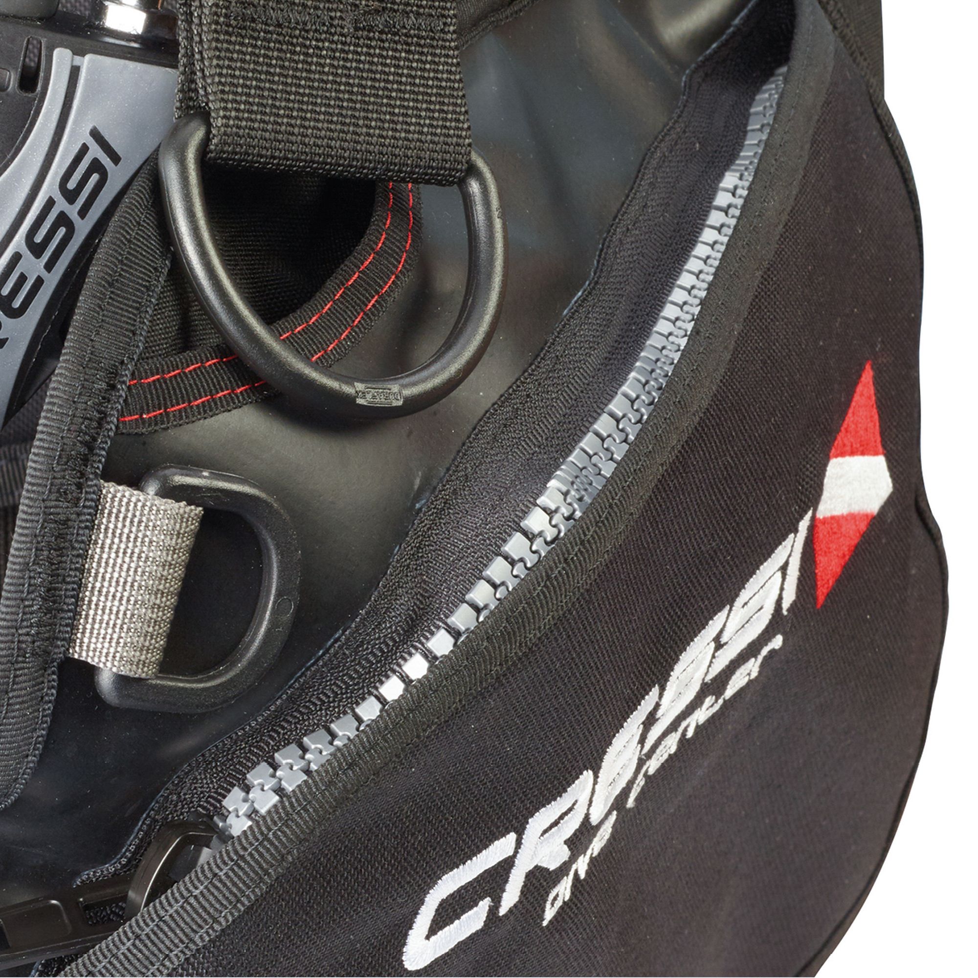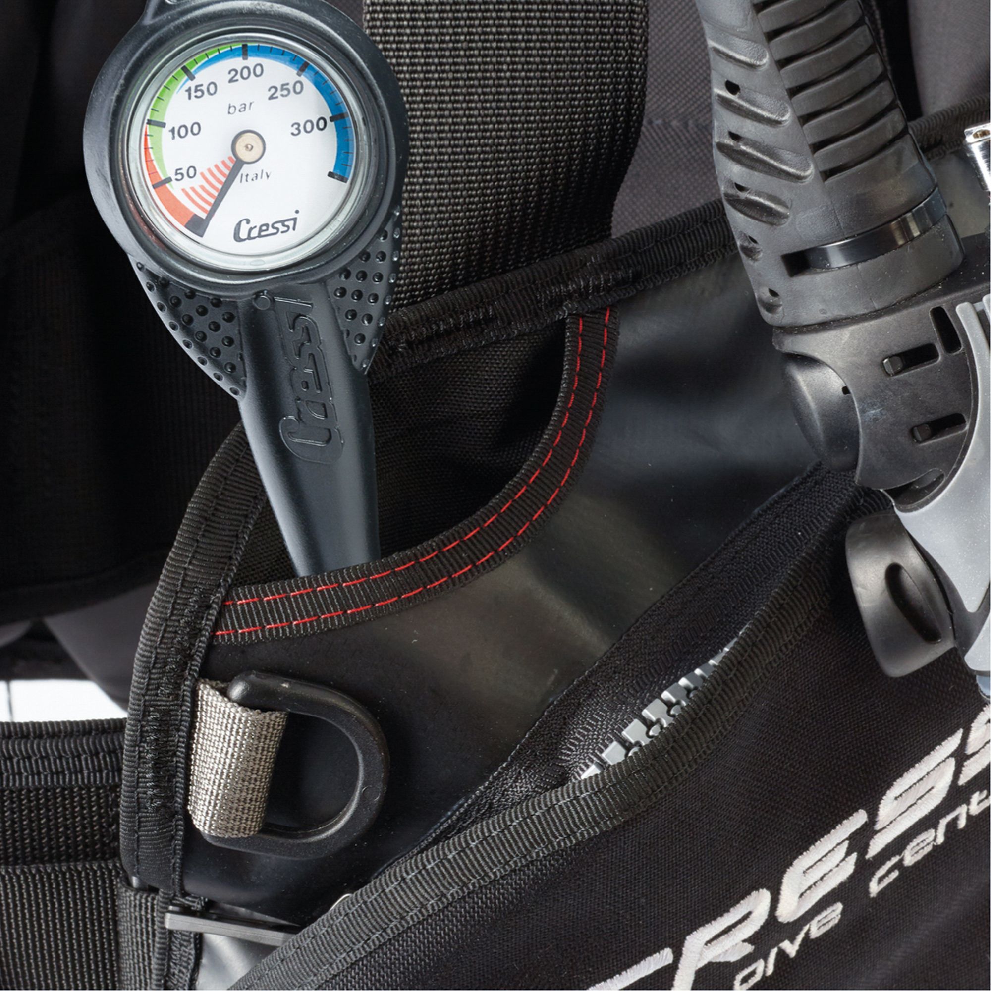 • Two zippered pockets, two durable plastic D-rings and dedicated gauge and octopus holders provide plenty of storage options.