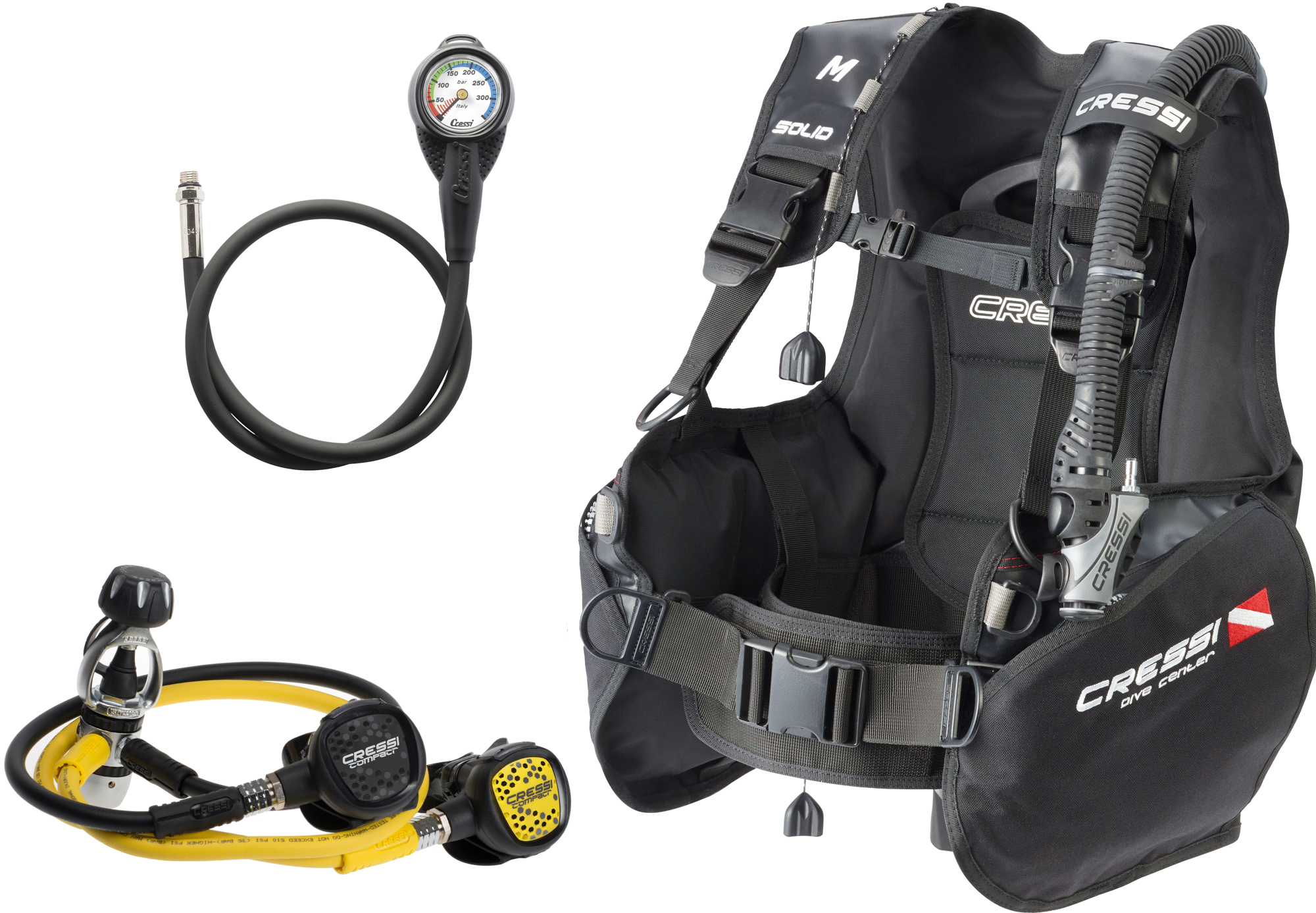A complete scuba set including: B.C.D. Solid 1st stage ac2 2nd stage compact octopus compact pressure gauge