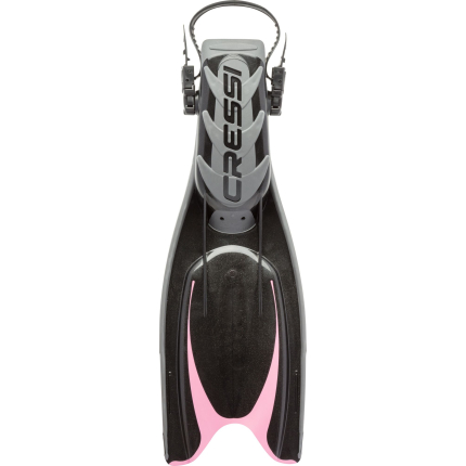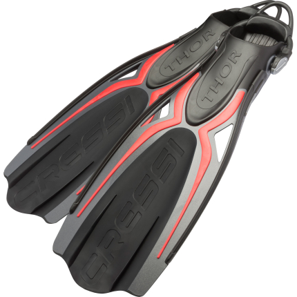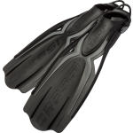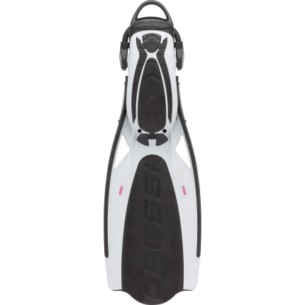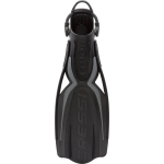 Brand new design for this extremely effective and yet very easy to use fin. The special arched profile of the fins combined with the two central ribs promote a significant flow convection effect, known as “spoon effect”, which stabilises and boosts propulsion. Two lateral holes discharge the negative forces typically associated with this area and at the same time make for enhanced stability. The blades are moulded from two different materials for improved reactivity. These fins are perfect for scuba diving, whether you are an experienced diver or a novice