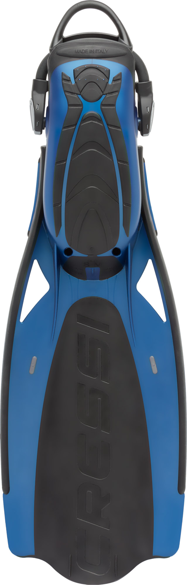 Brand new design for this extremely effective and yet very easy to use fin. The special arched profile of the fins combined with the two central ribs promote a significant flow convection effect, known as “spoon effect”, which stabilises and boosts propulsion. Two lateral holes discharge the negative forces typically associated with this area and at the same time make for enhanced stability. The blades are moulded from two different materials for improved reactivity. These fins are perfect for scuba diving, whether you are an experienced diver or a novice