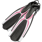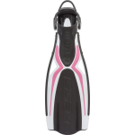 Brand new design for this extremely effective and yet very easy to use fin. The special arched profile of the fins combined with the two central ribs promote a significant flow convection effect, known as “spoon effect”, which stabilises and boosts propulsion. Two lateral holes discharge the negative forces typically associated with this area and at the same time make for enhanced stability. The blades are moulded from two different materials for improved reactivity. These fins are perfect for scuba diving, whether you are an experienced diver or a novice