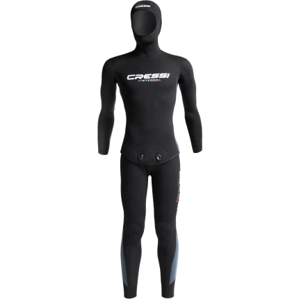 Wetsuit created with the exclusive new cressi camouflage dark digital specter pat, computer designed to make it more difficult for prey to create solid images, thereby confusing the wearer with the background. Preformed anatomical cut. Jacket with padded reinforcement in the chest, smoothskin watertight seals on the hood, wrists, and waist, and reinforced powertex lining at the elbows and waist. High-waisted trousers with watertight smoothskin seals at the ankles and waist, and powertex reinforcements on the knees. Camouflage color: dark-specter