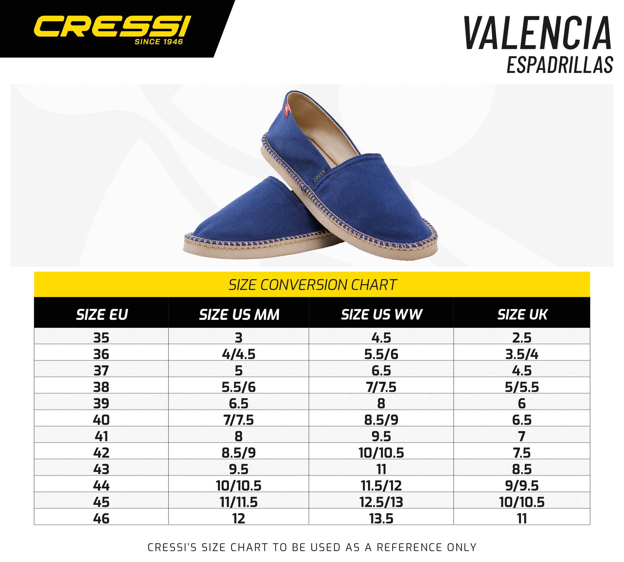 Cressi valencia are comfortable unisex multipurpose espadrilles, perfect for summer. Durable and painstakingly trimmed fabric with a sole in a soft and comfortable rubber material. Easy to put on, they also help keep out sand and can be worn in the water. The use of high-quality materials makes them stand out.