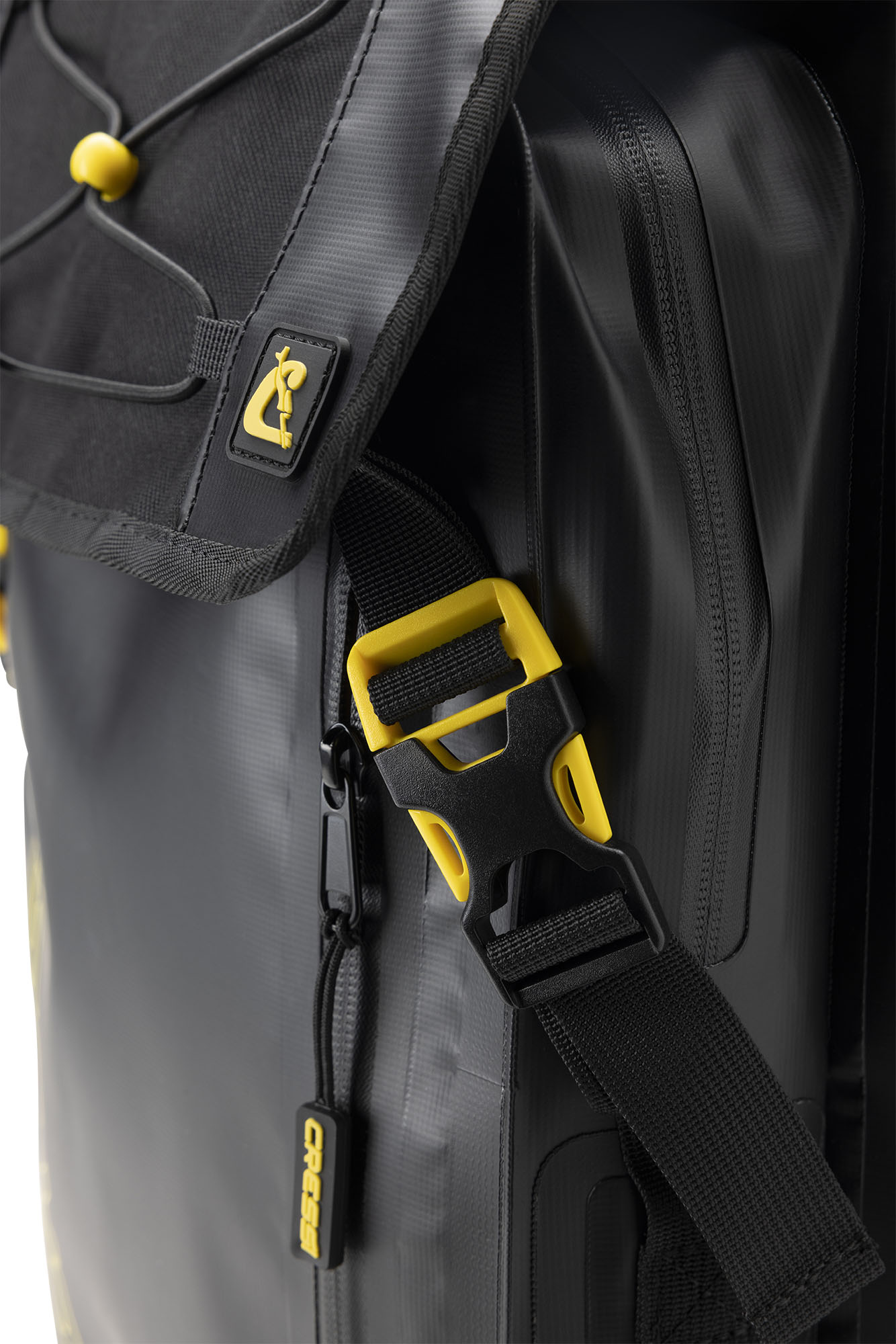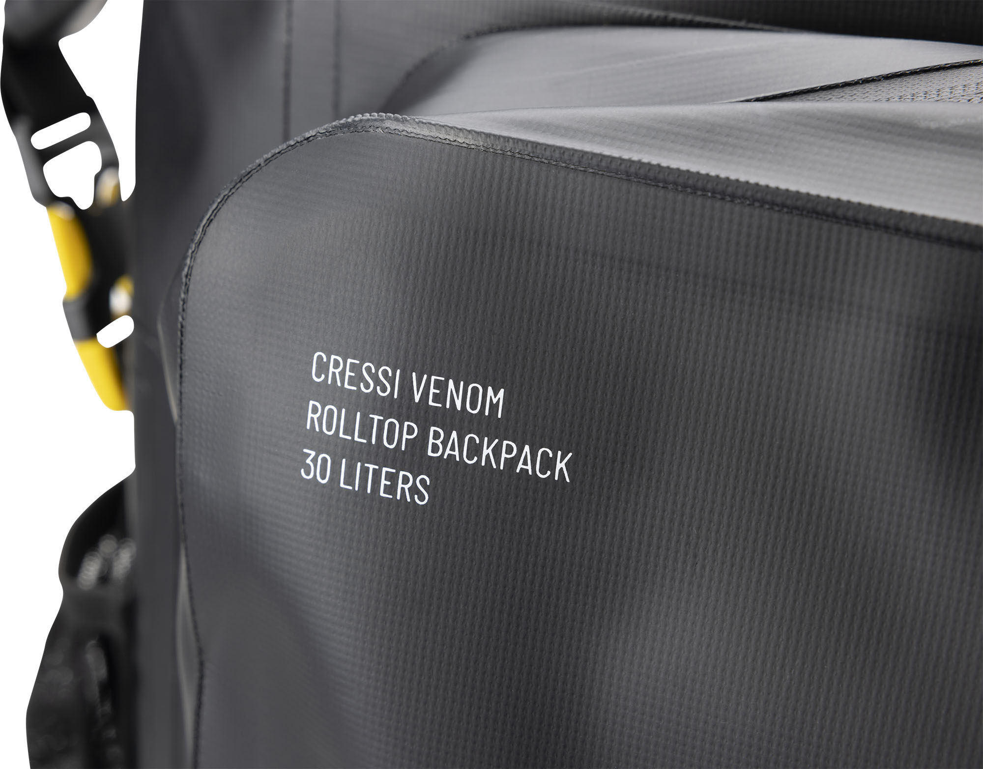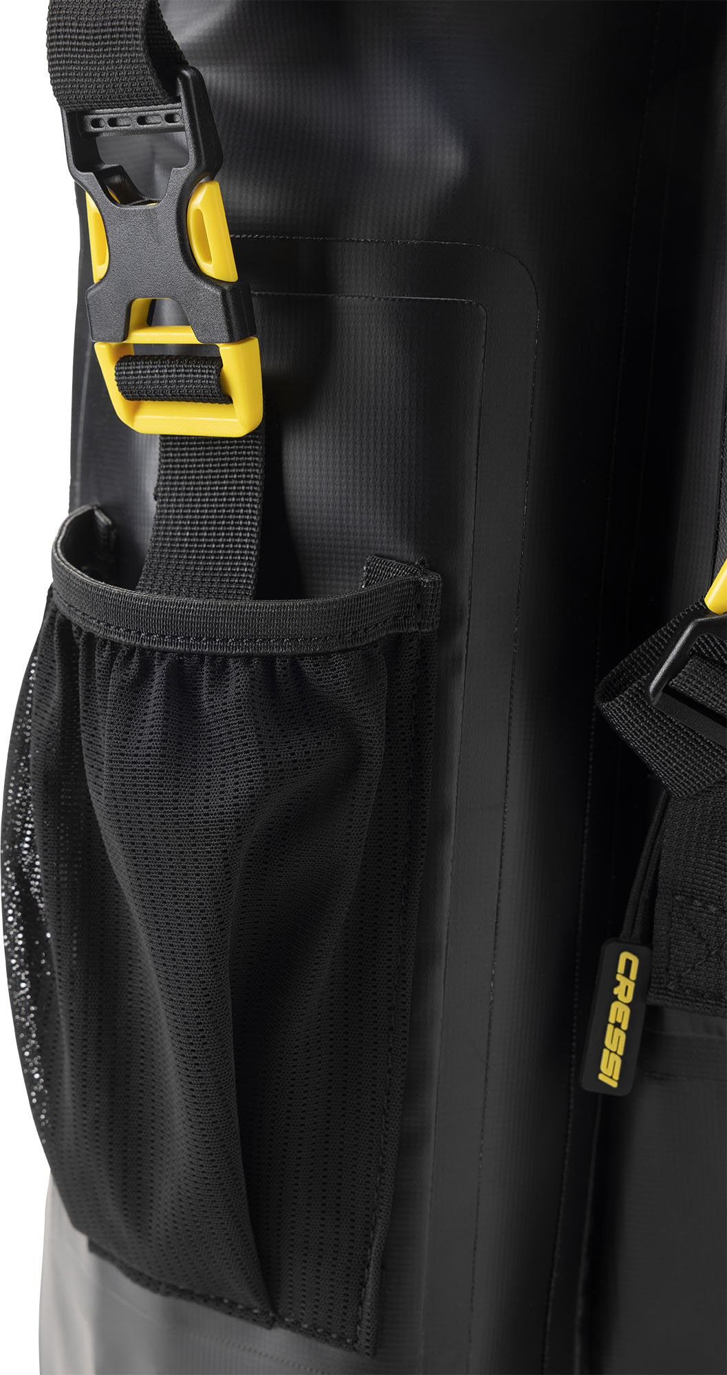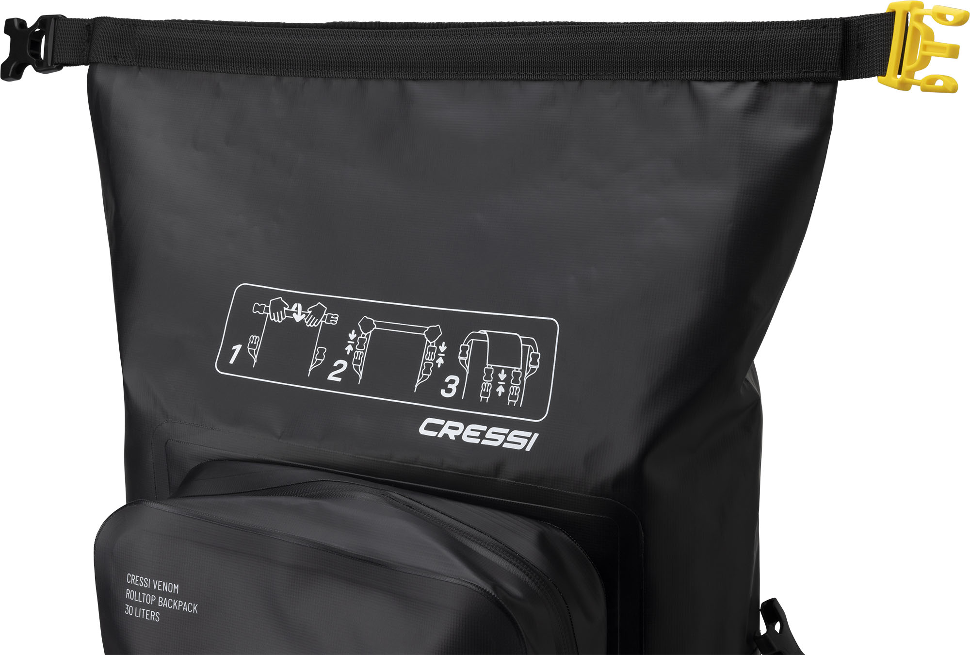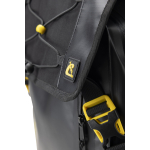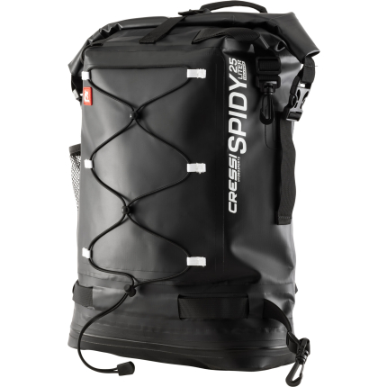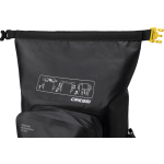 Venom is a rolltop backpack consisting of a waterproof PVC tarpaulin compartment for carrying wetsuits and wet gear. Welded onto the front is a 5-litre compartment, consisting of two pockets, a larger and a smaller one for wallets and small things. The rucksack also has a mesh pocket for bottles, practical D-rings on the bottom for hanging gear and drying the rucksack upside down, and an elastic cord on the top flap cover for carrying extended items.