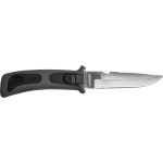 A small, flat and ergonomic knife, with a rapid sheathing and drawing system that prevents accidental loss as two push buttons must be pressed simultaneously to extract the knife from the sheath. The handle is minimalist, of a flat, ergonomic design and covered with anti-slip rubber for a secure grip. The blade is made of tempered 401 stainless steel. The duration of these features is guaranteed not by the sharpness itself, but by the quality of the material that guarantees the durability of the blade. Rhomboidal blade cross section for greater resistance to flexing and breaking. One side has a smooth edge and the other is partially serrated with a rope cutter. Can be attached to the calf or belt using rubber straps with buckles