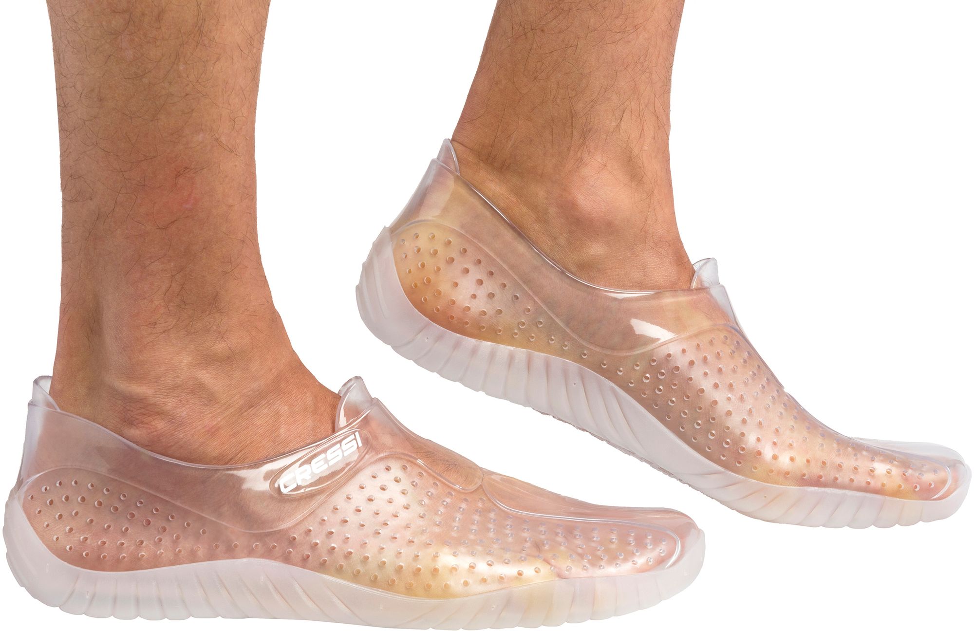 Cressi water shoes are made of soft, lightweight elastic material. The sole has a non-skid design, and the upper is perforated along most of its surface, with a reinforced toe and heel. Comfortable for pool, boat, or reef, and perfect for travel